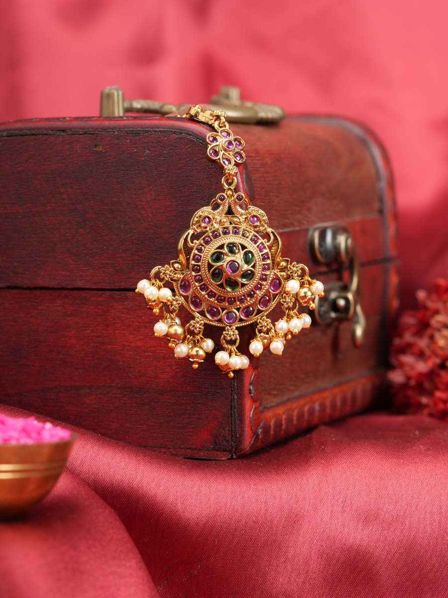 An ode to devotion and divine beauty, Aaradhya Rupam is a temple-style maang tikka that radiates grace from every angle. Crafted in a traditional circular mandala design, this intricate piece features a mesmerizing blend of ruby-hued stones and green accents, delicately bordered with pearls and golden drops. It sits beautifully at the center of the forehead, reminiscent of goddess adornments from classical Indian temples. Whether worn with a saree or lehenga, it completes your festive or bridal look with timeless grandeur and spiritual charm.