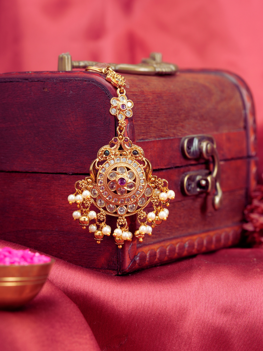 Adorned with radiant stones, classic floral motifs, and pearl drops, Aaradhya Tejam is crafted to echo the divine brilliance of temple art. The warm gold base paired with shimmering crystals and hints of green brings a celestial glow to your festive look. Whether it’s a wedding or a puja, this tikka adds a spiritual sparkle to your style—just like its sister piece, Aaradhya Rupam.
