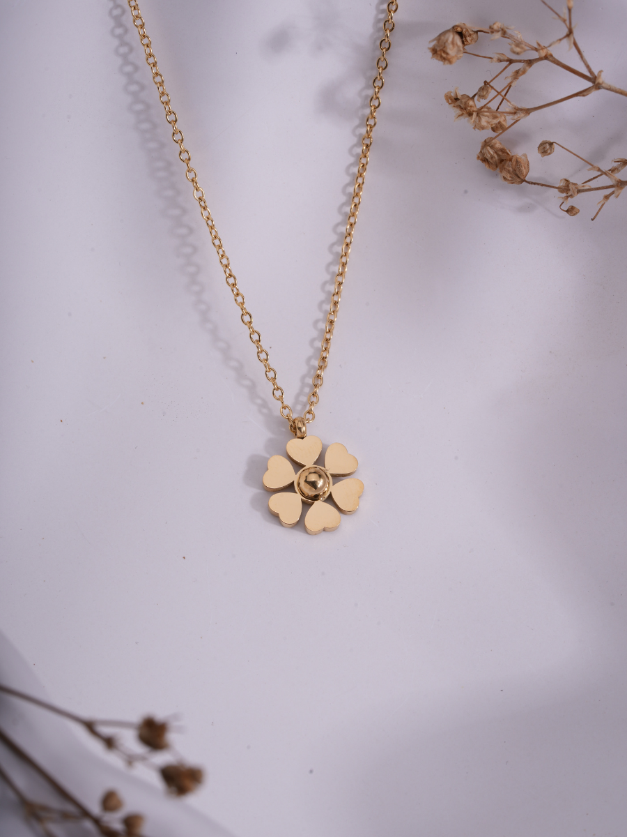 Let your style blossom with Amoura Bloom – a charming gold-toned necklace featuring a floral pendant crafted from heart-shaped petals and a radiant center. Symbolizing love, luck, and new beginnings, this piece is a delicate fusion of romance and nature.