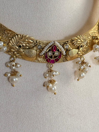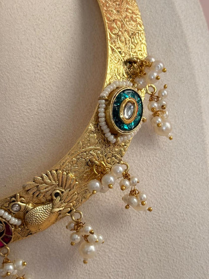 Elevate every ensemble with the "Mystic Heirloom Hasli Set"—a handcrafted statement Hasli inspired by regal temple artistry set upon a meticulously handcrafted embossed band that adds rich texture and artisanal charm. This striking piece features intricate detailing, colorful meenakari motifs, and delicate pearl danglings, capturing the essence of heritage and mystique. The hasli’s timeless design celebrates tradition while complementing both modern and classic looks.