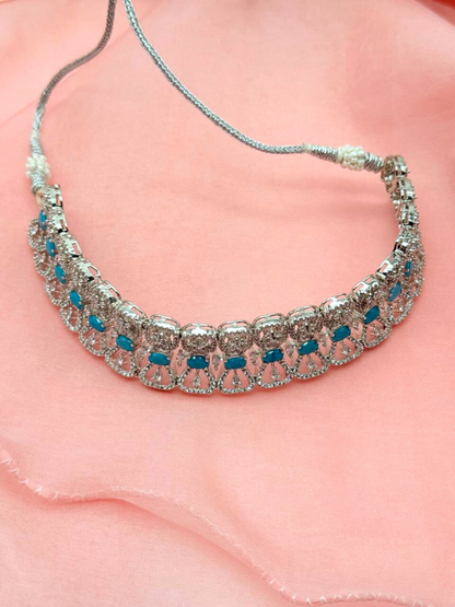 Bring a pop of refreshing elegance to your look with the Azure Bloom AD Choker Set. Featuring radiant turquoise blue stones framed with dazzling American diamonds, this choker is designed to stand out. The intricate geometric pattern adds a modern edge while maintaining a traditional charm, making it a versatile choice for both ethnic and fusion wear.