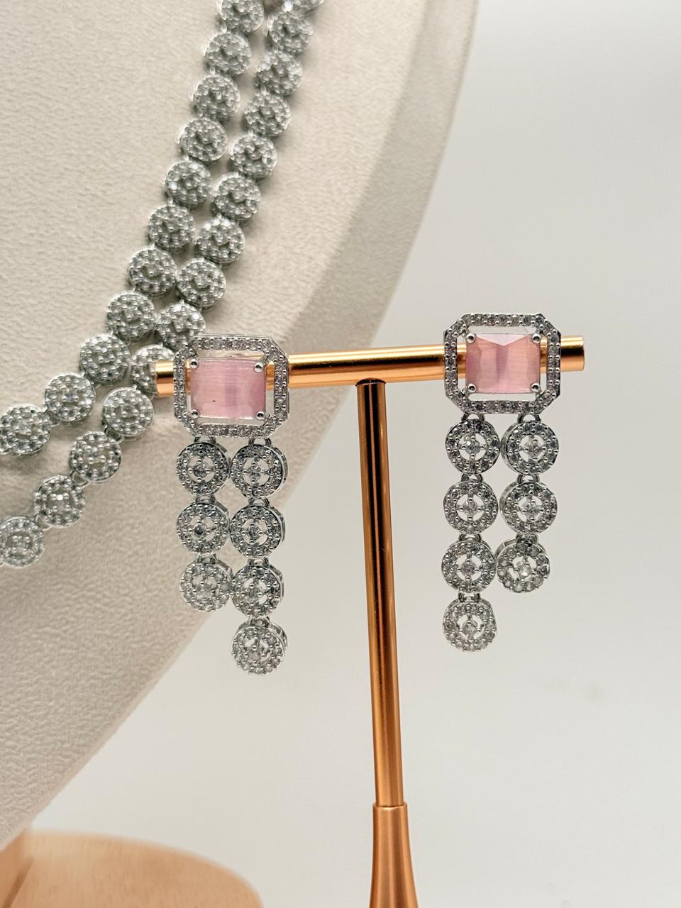 Delicate blush-pink stones add a romantic warmth to the cascading AD sparkle. Feminine yet glamorous, this variant is designed to highlight subtle grace with royal appeal.