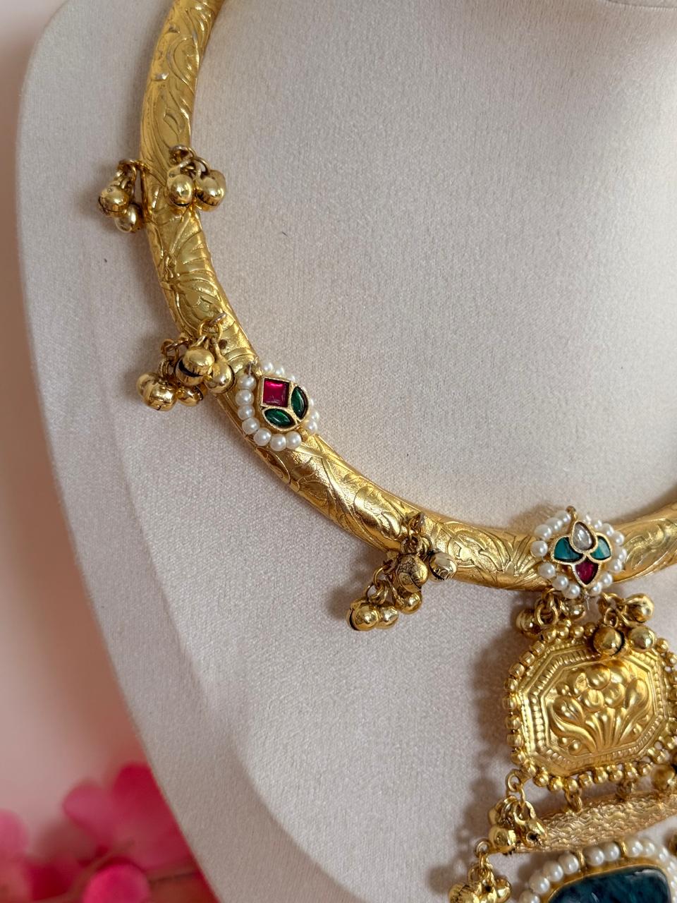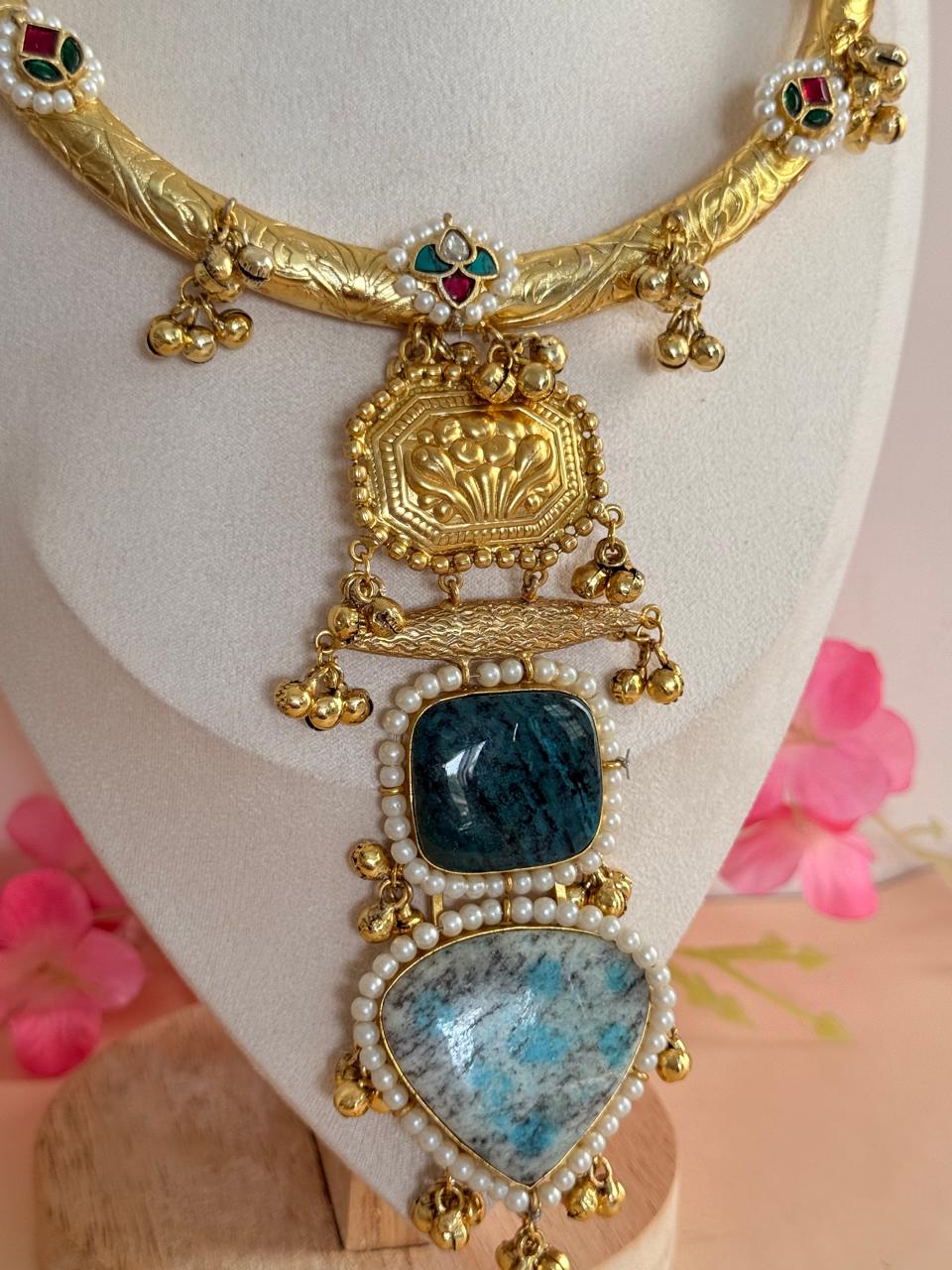 A regal hasli crafted in antique gold with intricate motifs, adorned with striking blue gemstones and delicate pearl accents. This statement piece embodies timeless elegance, merging traditional artistry with bold sophistication. Without the need for earrings, it stands on its own as a masterpiece of grandeur.