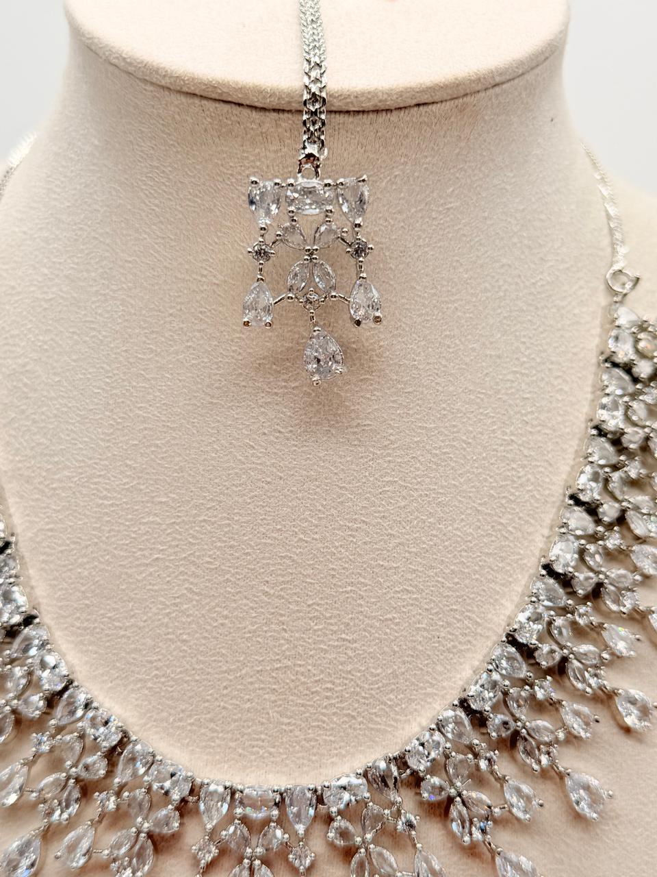 The Clear Crystalfall AD Necklace Set with Maang Tikka embodies classic grandeur with luminous white stones arranged in a flowing chandelier silhouette. Each crystal reflects brilliant light, while the cascading drops add mesmerizing movement. This versatile colorway complements traditional reds, ivories, gold sarees, champagne lehengas, and contemporary bridal outfits.
