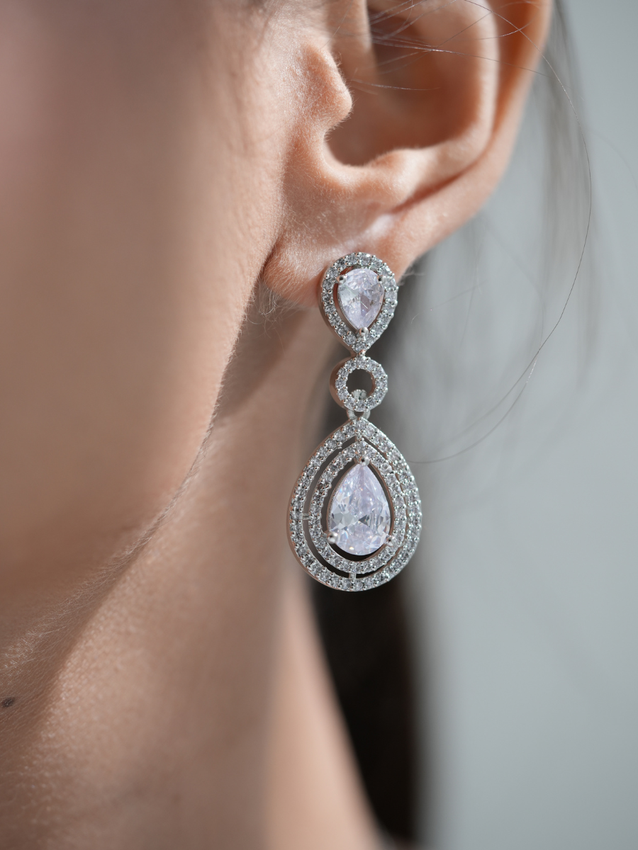 The Crown Cascade – Crystal Clear Edition is the pure expression of regal elegance. Featuring a graceful tear-drop cascade of high-shine AD stones, each layer glimmers with diamond-like clarity, creating a fluid silhouette that softly hugs the neckline. Its luminous sparkle makes it the ultimate choice for bridal wear, reception glam, or any grand evening where refined radiance takes center stage. Paired with matching earrings, this piece speaks of heritage beauty reimagined for modern royalty.