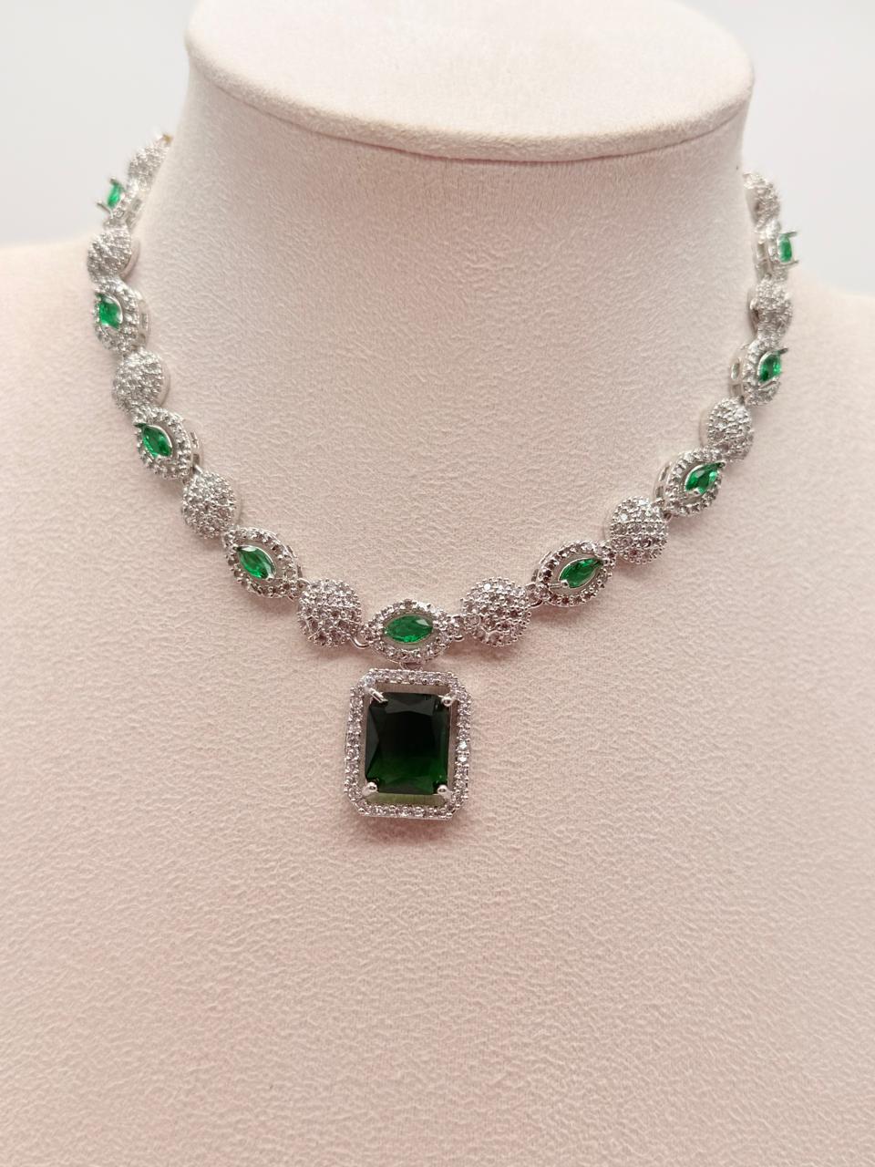 A vision of regal beauty, Elara Emerald AD Necklace Set showcases a radiant emerald-cut centre stone embraced by a shimmering halo of fine American Diamonds. The necklace flows into marquise and round crystal motifs, creating a graceful, connected pattern that reflects light with every movement. Perfectly balanced between bold elegance and delicate detailing, this set includes exquisitely matched drop earrings that elevate the overall look with royal charm.