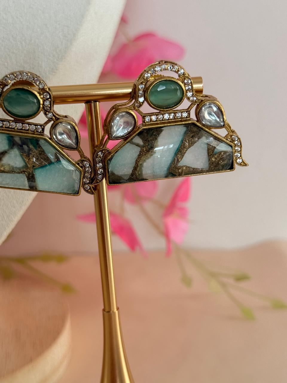 A regal blend of heritage artistry and vibrant turquoise elegance, this necklace set captures timeless charm with its intricate polki-style detailing and mosaic turquoise stones. Its antique gold finish beautifully complements the calm green-blue hues, creating a statement that echoes royal grandeur.
