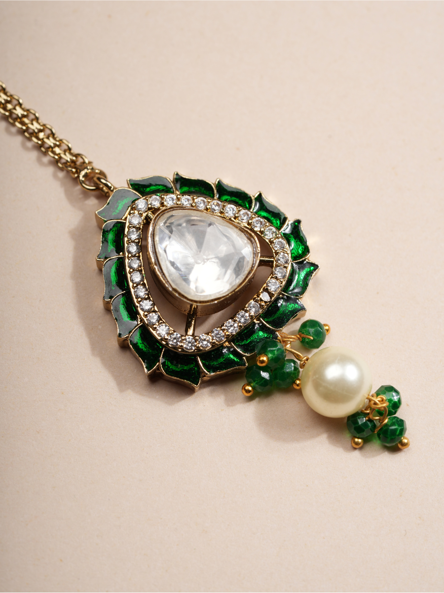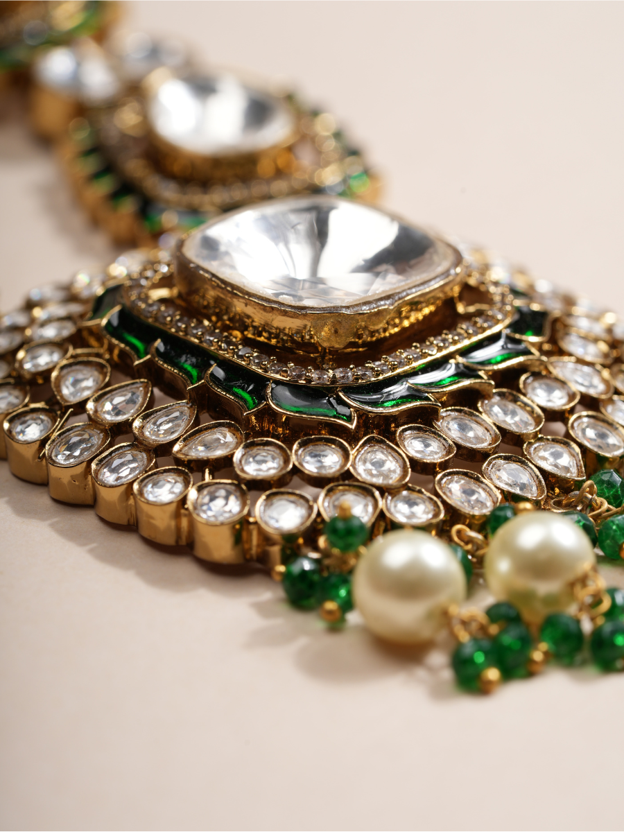 Experience true regal charm with the Emerald Radiance Polki Kundan Bridal Necklace & Earrings Set. This majestic ensemble features a lavish necklace intricately crafted with large teardrop and square-cut polki kundan stones, bordered by rich emerald green enamel and gold detailing. The design flows beautifully along the neckline, with alternating polki elements joined by sparkling crystal accents and traditional four-petal motifs.