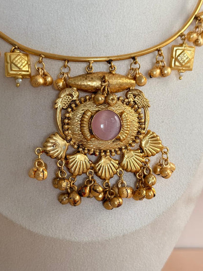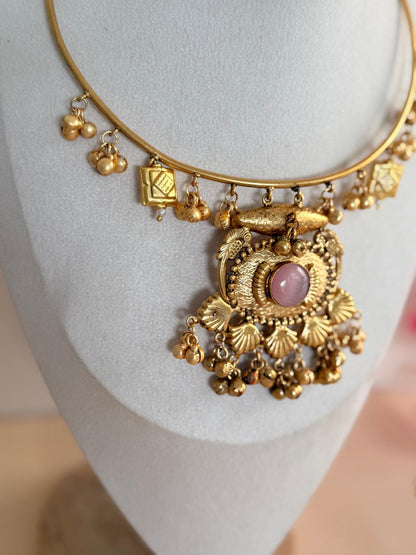 The Royal Radiance Hasli Set embodies timeless elegance with its stunning golden finish and intricate craftsmanship. Highlighted by a bold pendant featuring delicate motifs and embellishments, this set radiates sophistication fit for royalty.