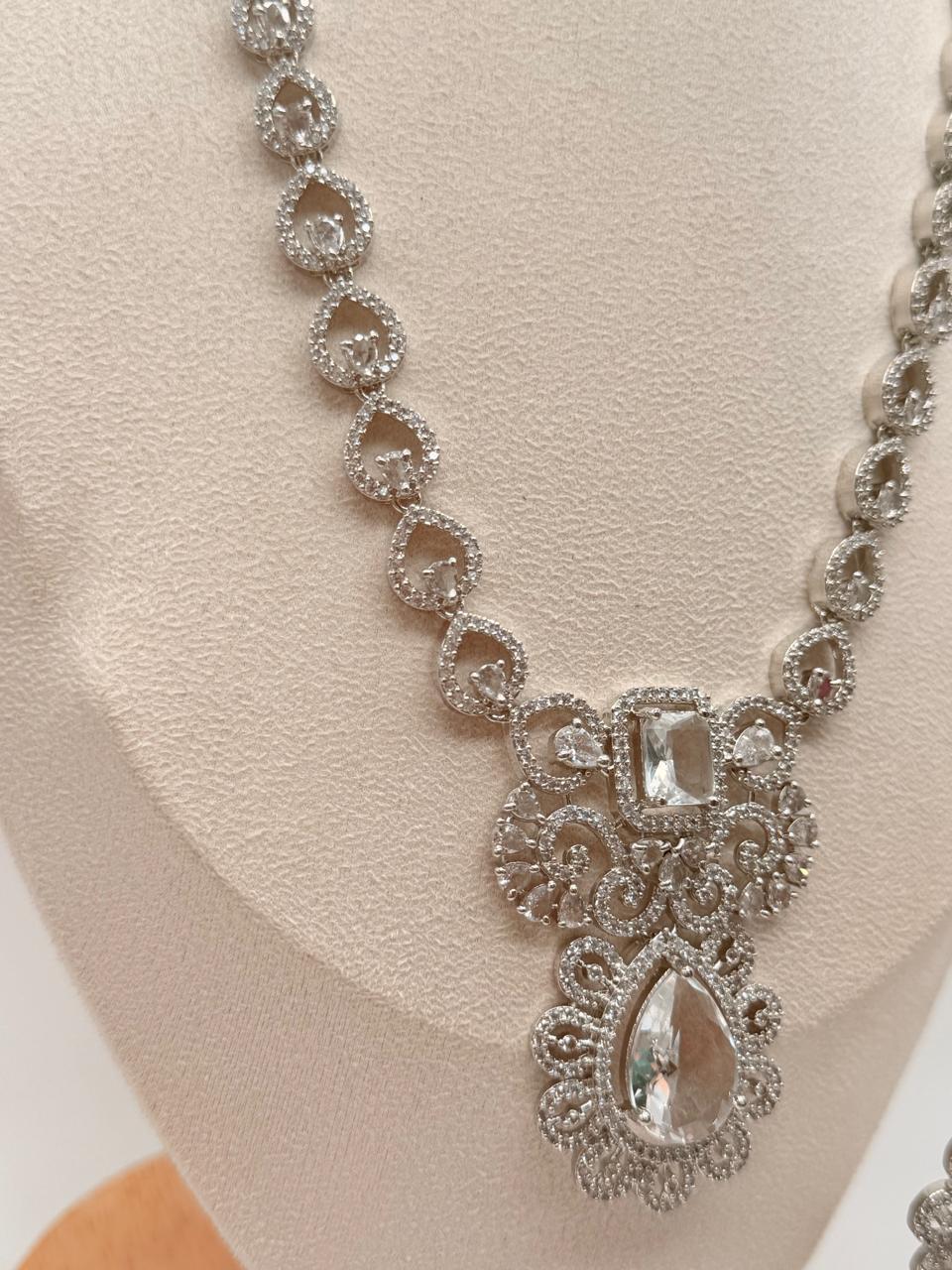 The Florencia AD Necklace Set – Clear radiates classic luxury with its crystal-clear stones and brilliant AD detailing. The ornate floral drop design creates a regal silhouette that complements both traditional and contemporary ensembles. Designed to catch light from every angle, this variant offers maximum sparkle while preserving a refinery that never goes out of style.