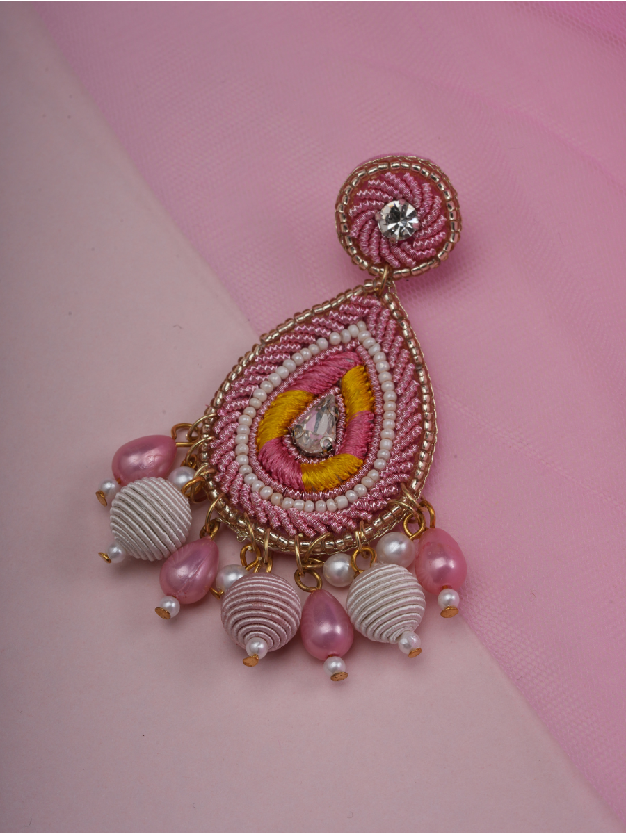 Bring the bloom to every celebration with Gulbahaar, a vibrant handcrafted jewellery set that’s all about colours, culture, and unmatched charm. This multi-piece set features a bold choker, grand earrings, a maang tikka, and intricate haathphools – all adorned with mirror work, shells, crystals, pearls, and radiant thread embroidery in pink, yellow, and white.