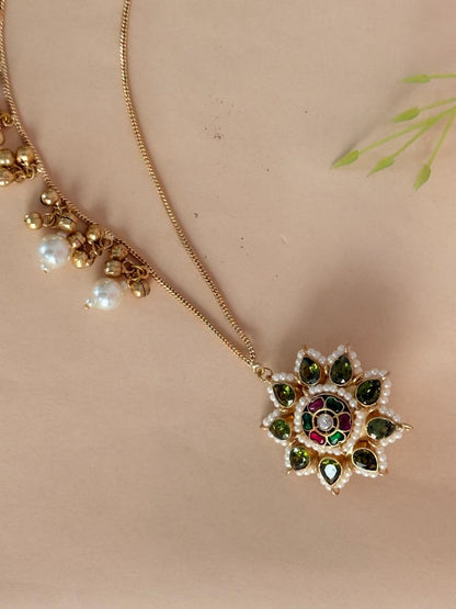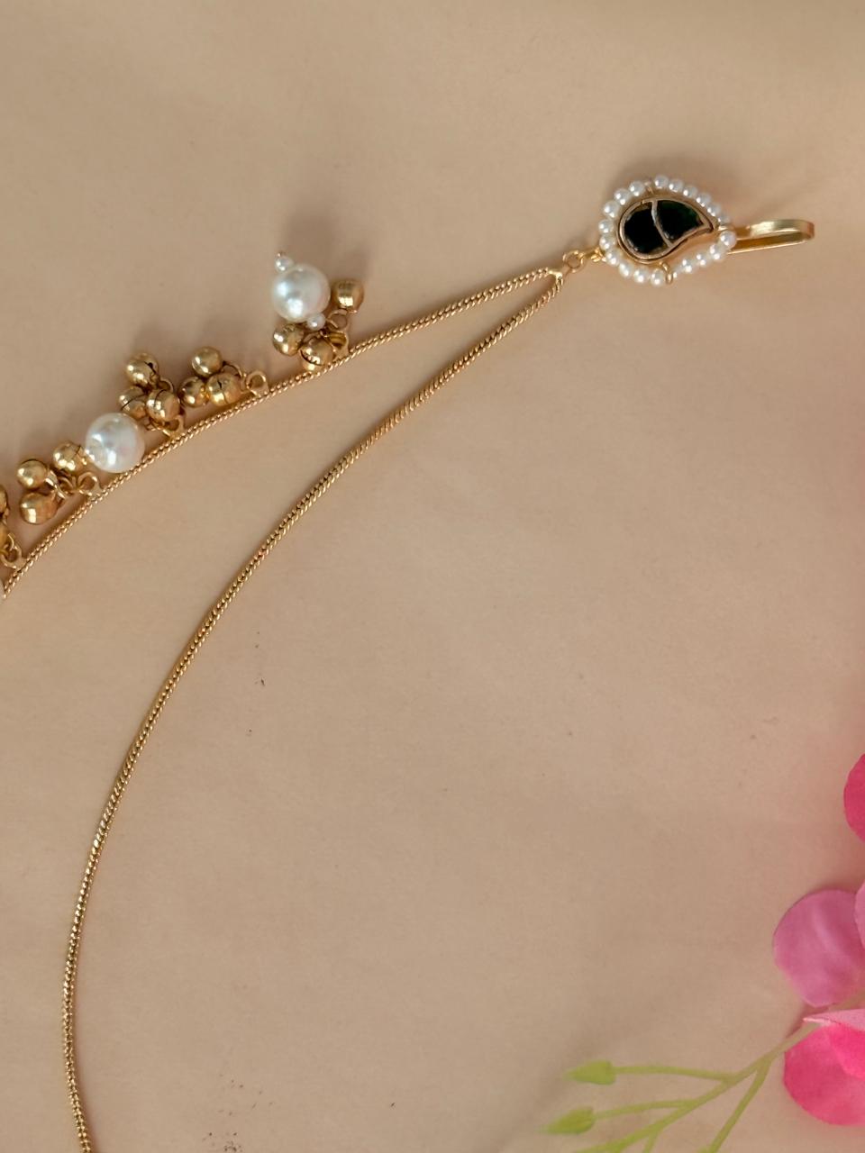Gulnisa - Green Kashmiri Kaan Chain Earrings showcase a dazzling star-like floral stud set with kundan, polki, and touches of green and red meena enamel at the center for a rich, traditional look. From this regal centerpiece flow dual gold-toned chains—one minimal and one adorned with alternating white pearls and gold ball clusters, adding movement and grace. The design is completed with a signature paisley drop, also bordered in pearls, creating a classic and elegant silhouette. These earrings combine old-world craftsmanship with a contemporary edge, making them ideal for festive occasions, bridal ensembles, and those special moments that call for Kashmiri heritage with modern sophistication. Comfortable for all-day wear, Gulnisa will elevate any traditional or Indo-western outfit with its intricate detailing and dreamy elegance.