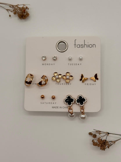 Switch up your look every day with the Her Hues 7 Days Chic Earring Set. This versatile collection includes seven unique earring pairs designed to match your mood and outfit for the entire week. From classic pearl studs and sparkling crystals to floral accents, golden hoops, and statement danglers with pearls, this set has it all.