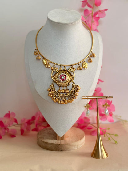 Ruby Reverie Hasli Set captures the essence of heritage with its intricate gold design and a radiant ruby centerpiece that symbolizes passion and elegance. This exquisite hasli set balances tradition with timeless beauty, making it a perfect statement piece.
