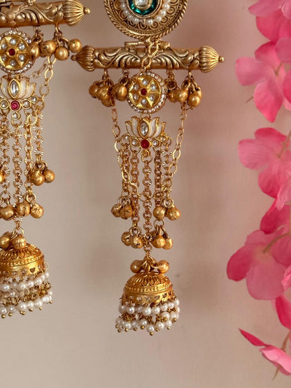 Kuhu Chandni - White Lotus Kashmiri Earrings capture regal artistry and poetic nature motifs. The top features a delicate pastel stud edged in pearls, flowing into ornate circles framed by two graceful parrot birds. At the center sits a green pear-shaped stone surrounded by shimmering kundan and beaded detailing, evoking Mughal and Kashmiri influences. Suspended beneath is a horizontal gold bar adorned with lotus flower elements and intricate chain work, studded with red and white crystals for vivid color. Layered dangling chains dotted with playful ghungroo beads draw the eye and create soft movement, ending in classic temple-style jhumkas crowned with pearls. Each detail is a tribute to traditional elegance and festive grandeur, making these earrings ideal for weddings, festivals, and special occasions.