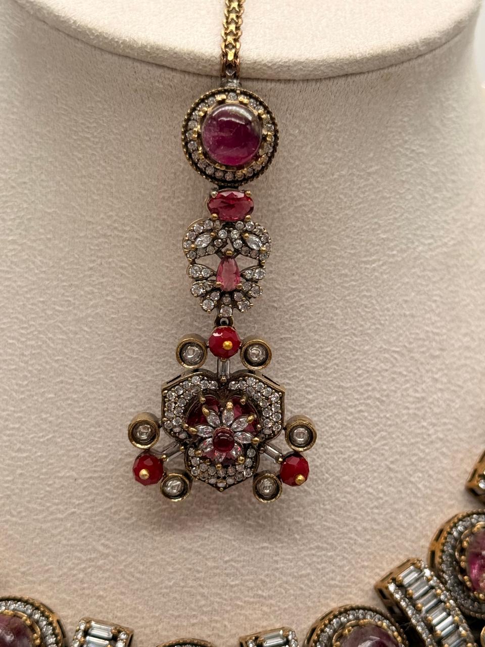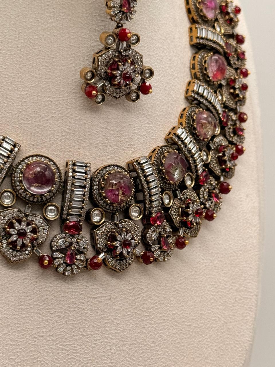 ✨ Aurevia Heirloom — Wine is a celebration of vintage opulence. Crafted with antique gold plating over an oxidised base, this set features deep wine-hued stones that create a striking contrast against the aged metal tones. Intricate detailing and classic craftsmanship lend it the charm of a royal heirloom—bold, graceful, and timeless.