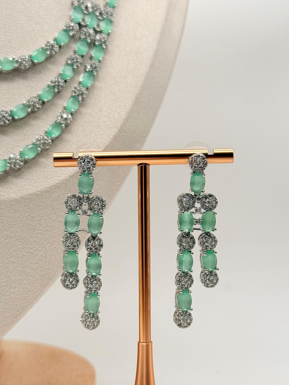 An exquisite double-layered masterpiece featuring luminous mint stones framed with dazzling crystals, Lumière Mintfall flows gracefully down the neckline like a royal cascade. Fresh, elegant, and distinctly modern, this necklace set strikes the perfect balance between minimal luxury and statement glamour.