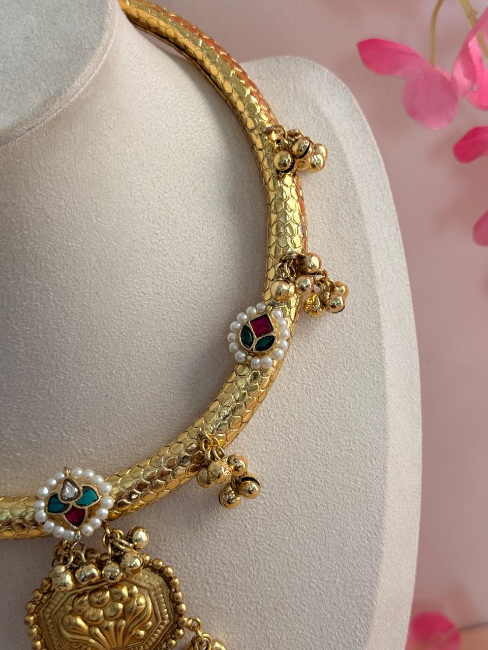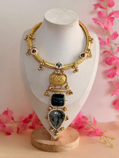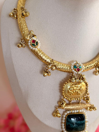 The Imperial Jade Cascade Hasli captivates with its exquisite antique gold finish and striking jade-inspired stones cascading in an elegant pendant design. Perfectly suited for pairing with traditional silk sarees, temple attire, and ethnic gowns, this majestic hasli adorns grand occasions like weddings, temple festivals, and cultural celebrations with timeless grace.