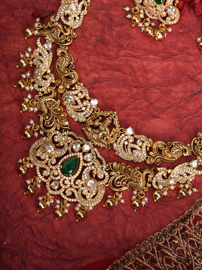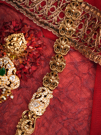 Manohari Vilas Shreehaar is an opulent long temple necklace, adorned with intricate deity motifs, sparkling stones, and traditional embellishments. Exuding regal elegance and divine charm, this exquisite haar is perfect for grand occasions, adding a touch of heritage and splendor to your ensemble.