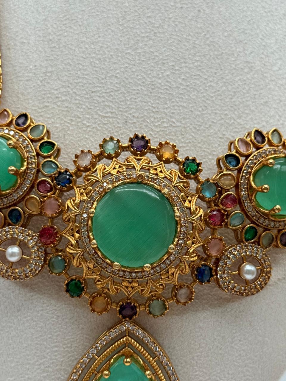 The Mint Royal Rosette Set celebrates heritage beauty with a soothing mint centre stone framed in vibrant multi-hued detailing. Its refreshing palette adds graceful charm, making it the perfect choice for wedding rituals, sangeet nights, festive banarasi sarees, pastel lehengas, and classic silk drapes.