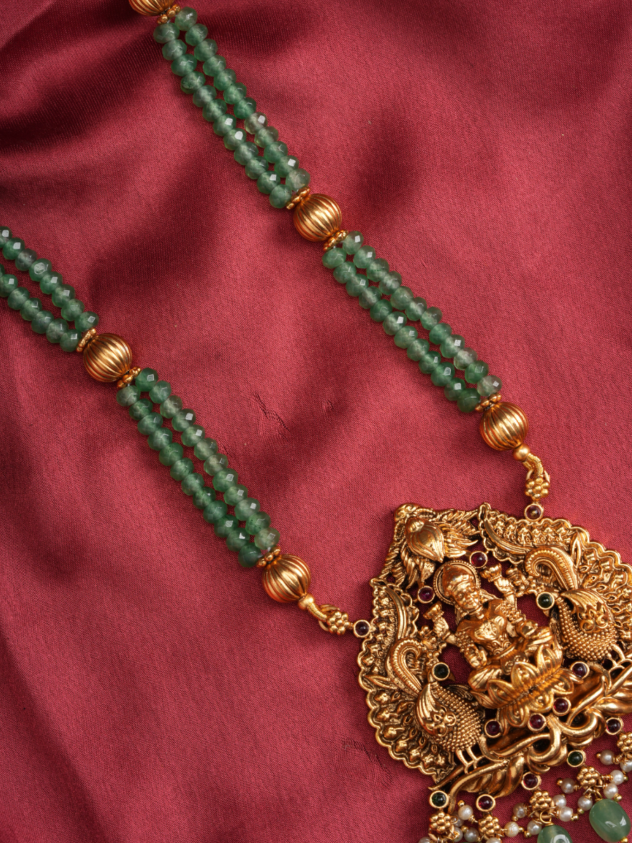 A divine temple haar featuring Goddess Lakshmi flanked by graceful peacocks, strung with green gemstone beads. Perfect for brides, festive sarees, and cultural celebrations.