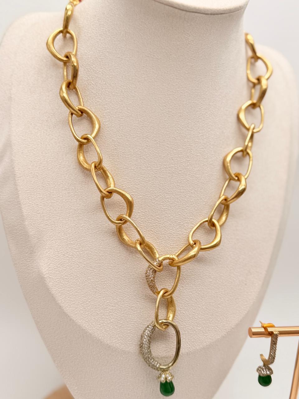 The Verde Link Royale Set highlights a vibrant emerald green doublet drop suspended from a luxe gold-toned chain. The sculpted links and delicate micro-stone sparkle create a stylish contrast against the rich green centre, making it a standout piece.