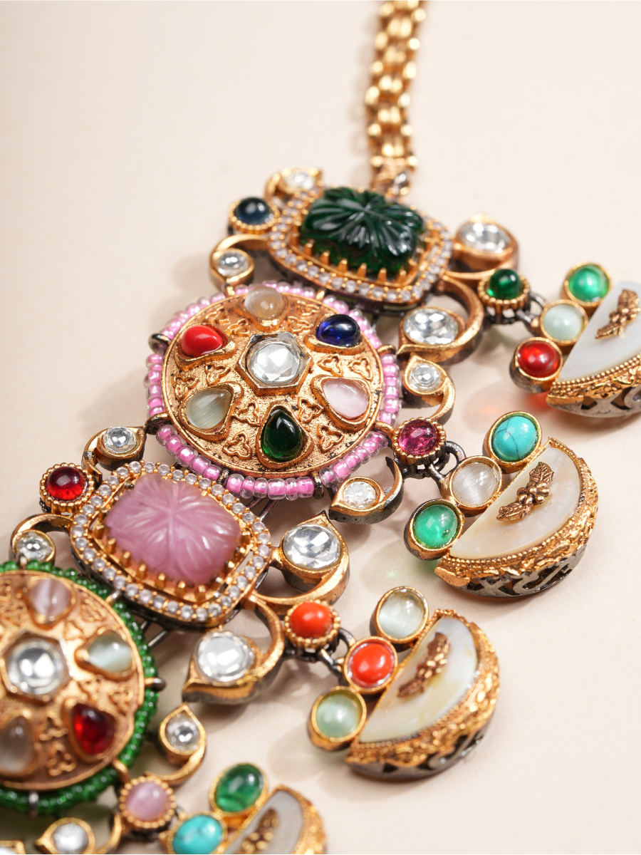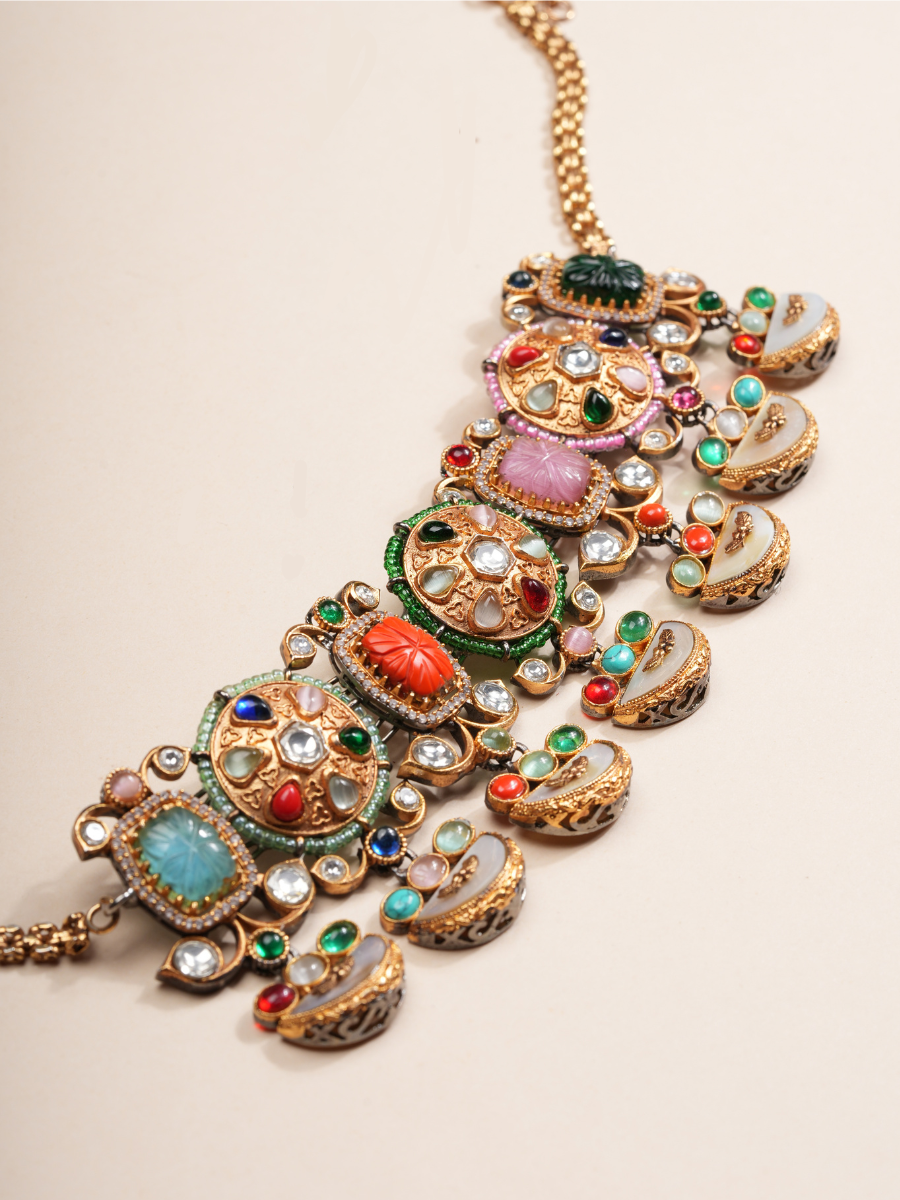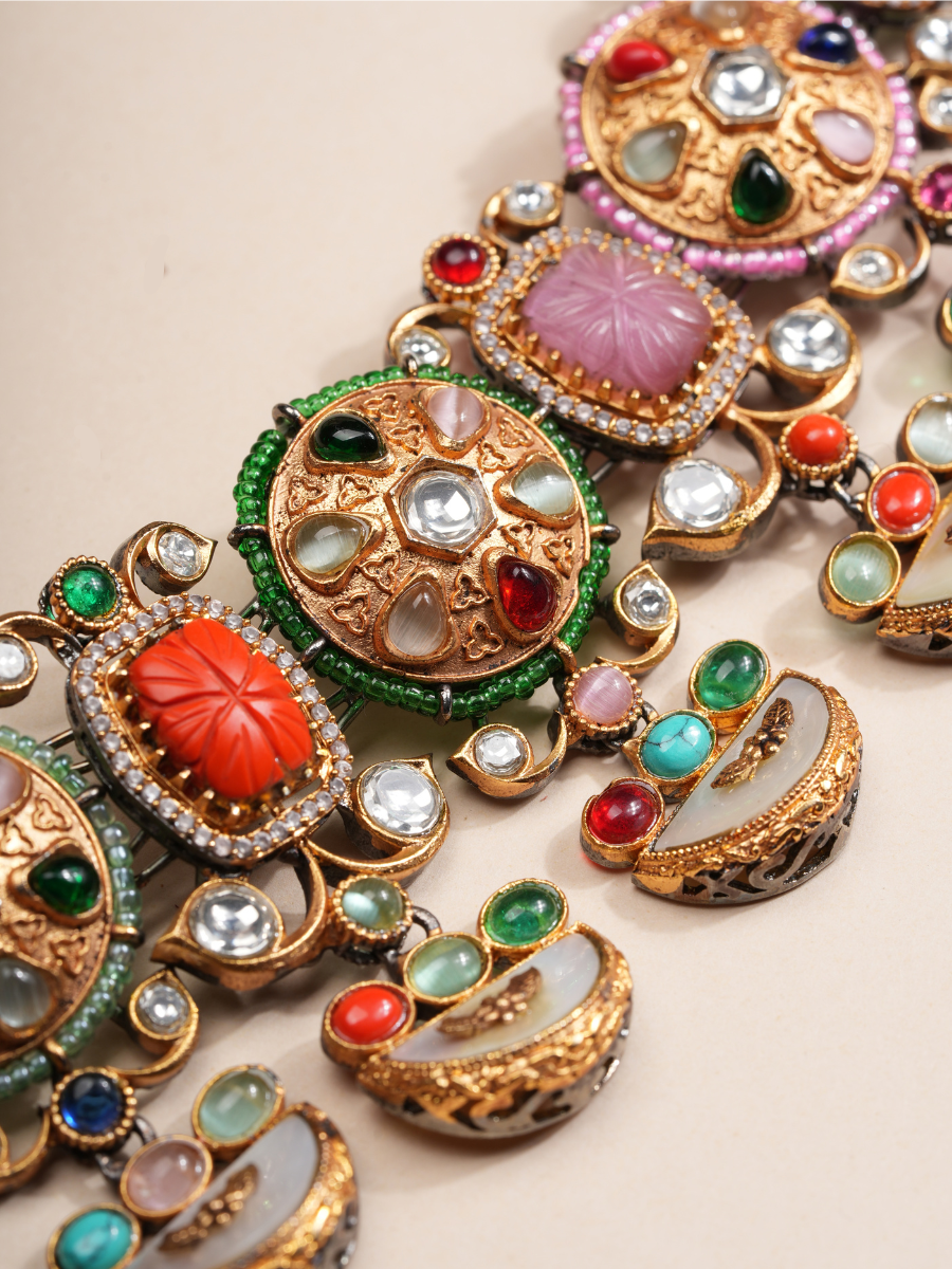 Infuse your look with color and artistry through the Mystic Carnival Gemstone Necklace & Earrings Set. This vibrant ensemble features a gilded choker-style necklace and matching earrings, each piece exquisitely handcrafted and embellished with an eclectic mix of pastel and jewel-toned gemstones. Ornate floral medallions are framed by classic kundan polki work, sparkling crystals, and bezel-set accents, bringing together the magic of vivid green, coral orange, lilac, turquoise, and ruby hues. Hand-carved stones and delicate pearls add dimension, while quirky beaded drops evoke the lively spirit of a festive carnival.