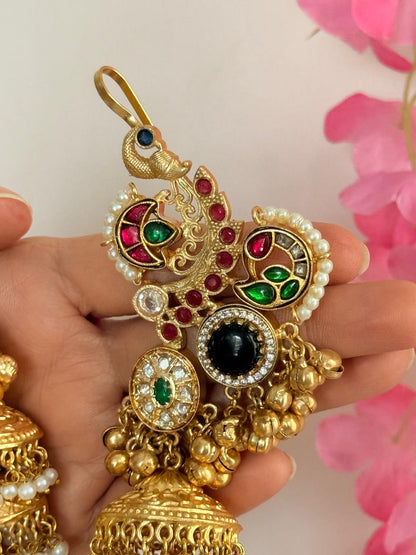 Noorveil - Black Pink Kashmiri Earcuff Jhumka brings together ornate peacock earcuff motifs sculpted in antique gold, highlighted with black and green stones, pink accents, and intricate kundan and pearl detailing. The earcuff curves gracefully along the ear, presenting vibrant meenakari work and bead arrangements to evoke the splendor of Mughal and Kashmiri jewelry traditions. Cascading below, three-tiered jhumka domes feature fine filigree patterns and shimmering white pearl borders, combined with whimsical ghungroo drops to add movement and character. The eye-catching black centerpiece imparts boldness, while green and red stones offer a rich contrast to the golden base, making these earrings ideal for weddings, cultural festivities, and occasions that demand a standout statement piece. With comfort-enhancing earcuff styling and heirloom-inspired craftsmanship, Noorveil is for those who embrace heritage, drama, and artistic flair in their accessories.