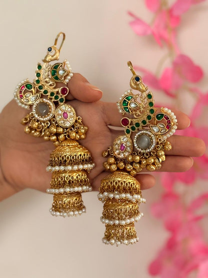 Noorveil - White Kashmiri Earcuff Jhumka is a breathtaking, statement-making piece rooted in royal tradition and temple grandeur. Featuring a sculpted peacock earcuff, this design brings together intricate patterns with brilliant green, red, blue and white enamel work, highlighted by kundan accents and pearl clusters along the curves. The lavish golden finish is complemented by ghungroo drops and three layers of grand, filigree-carved jhumkas, each crowned with delicate white pearl fringes for graceful movement and a showstopping silhouette. The unique ear-hugging style offers a secure fit and dramatic elegance, making these earrings perfect for weddings, bridal looks, classical dance recitals, and festive occasions where cultural grandeur is celebrated. Noorveil is for those who wish to capture the essence of heritage, femininity, and artistic flair in a standout accessory.