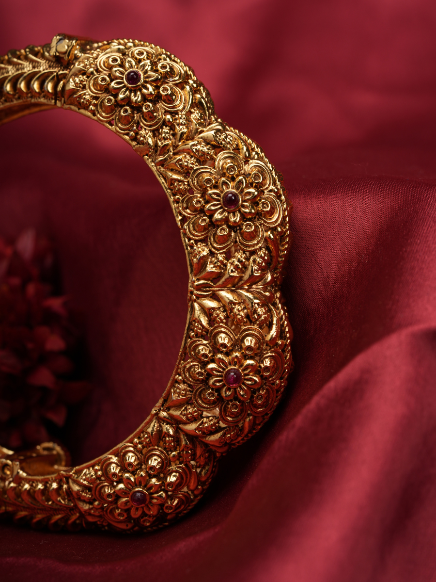 Step into the divine aura of temple traditions with Padmakriti Openable Kadas, where every detail whispers of devotion and timeless beauty. Intricately carved with lotus-inspired motifs and finished in antique gold tones, these openable kada-style bangles offer ease of wear without compromising on their bold, regal appeal.