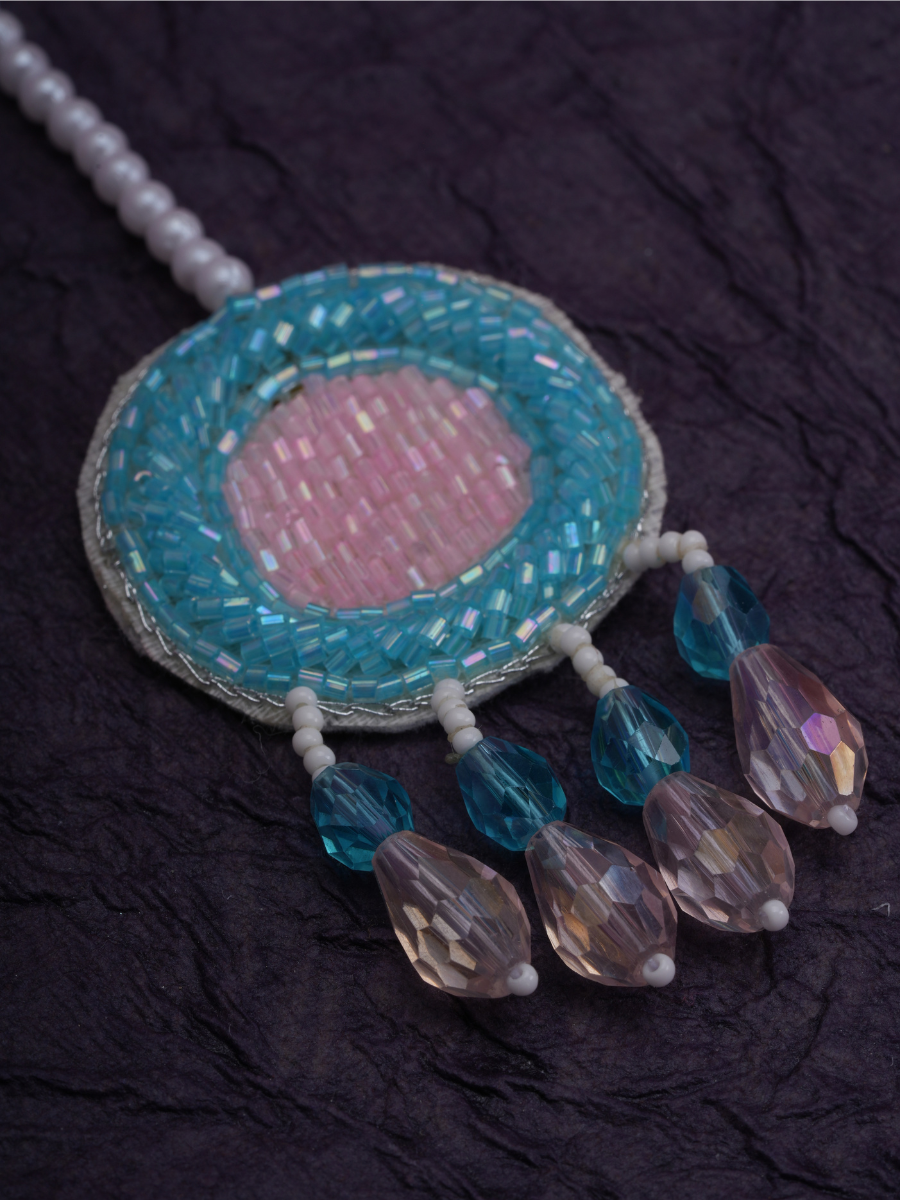 Step into a whimsical daydream with our Pastel Daze set – a dreamy fusion of soft pink and blue beadwork that’s entirely handmade and one of a kind. This playful set includes a statement choker, matching earrings, a maang tikka, and dramatic haathphools – all designed with meticulous circular beading, dainty danglers, and delicate thread work. Lightweight yet striking, it's perfect for those who love experimenting with colours, textures, and a touch of nostalgia in their festive or fusion looks. Pair it with ethnic, Indo-western, or even contemporary styles to add a pastel pop of handcrafted flair.
