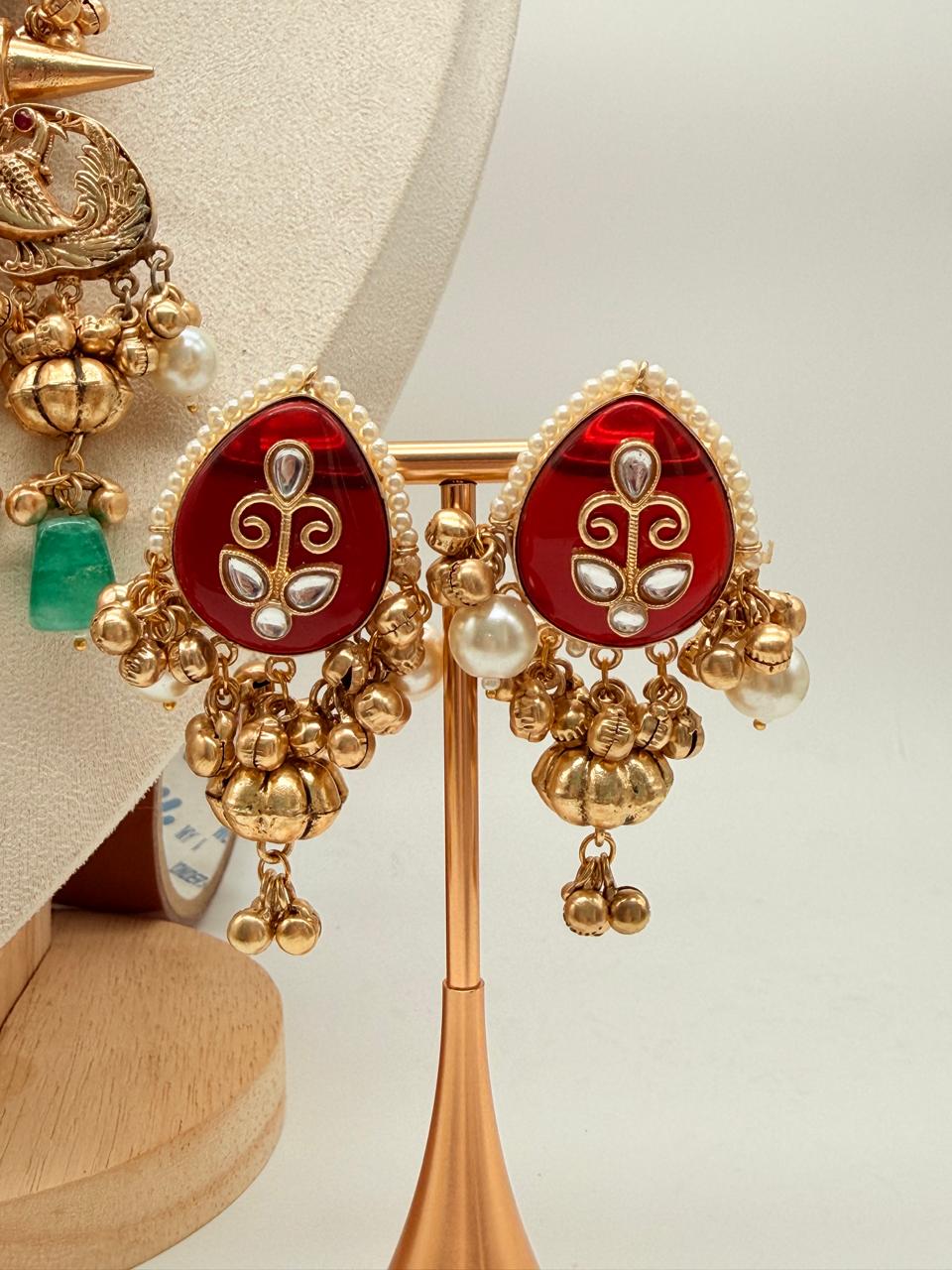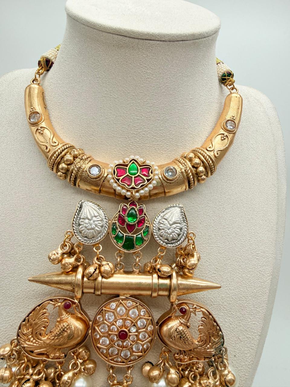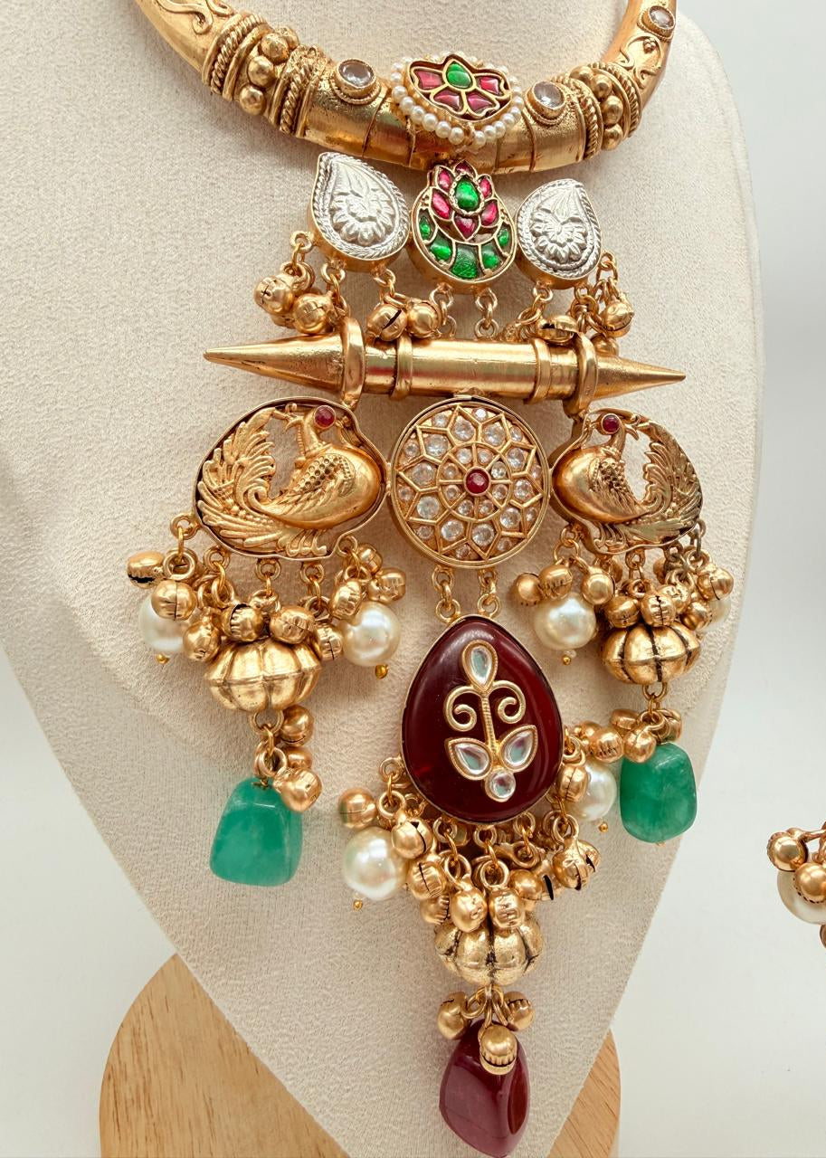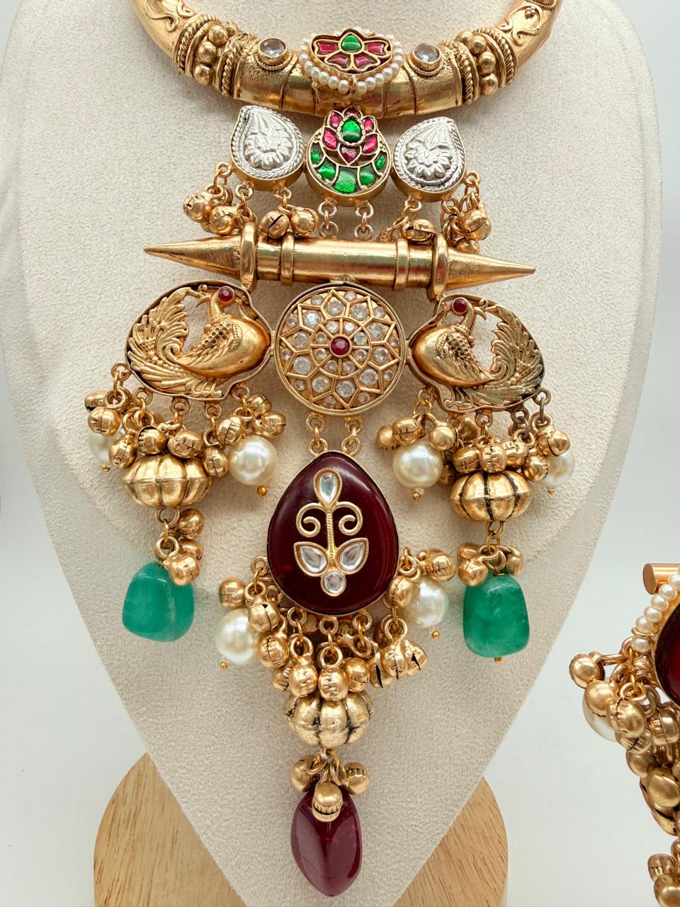 ✨Rich and majestic, the maroon variant of this royal hasli set exudes classic opulence. Deep maroon petal drops beautifully contrast with radiant pearls and antique gold accents, making it a striking choice for bridal wear, grand celebrations, and evening festivities.