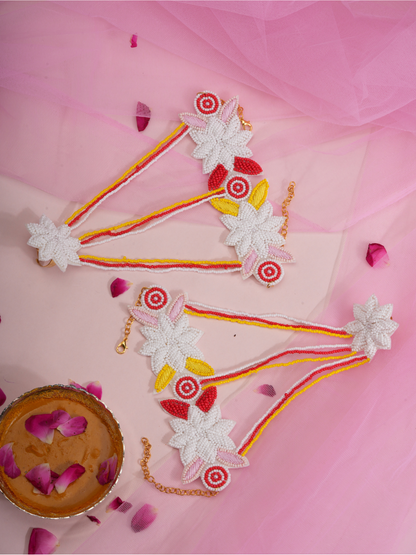 Celebrate the spirit of tradition with our Phool Jhilmil handmade jewellery set – a joyful burst of colors and culture. Crafted with intricate beadwork, this complete floral set includes a pair of haathphools (hand harnesses), statement earrings, a delicate maang tikka, and a show-stopping choker. With vibrant red, yellow, and white hues, this set is perfect for haldi, mehendi, or festive rituals. Lightweight and skin-friendly, it beautifully blends playfulness with ethnic elegance. Make heads turn at every wedding celebration with this unforgettable floral flair!