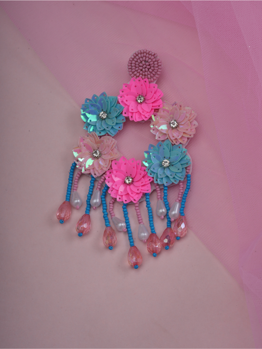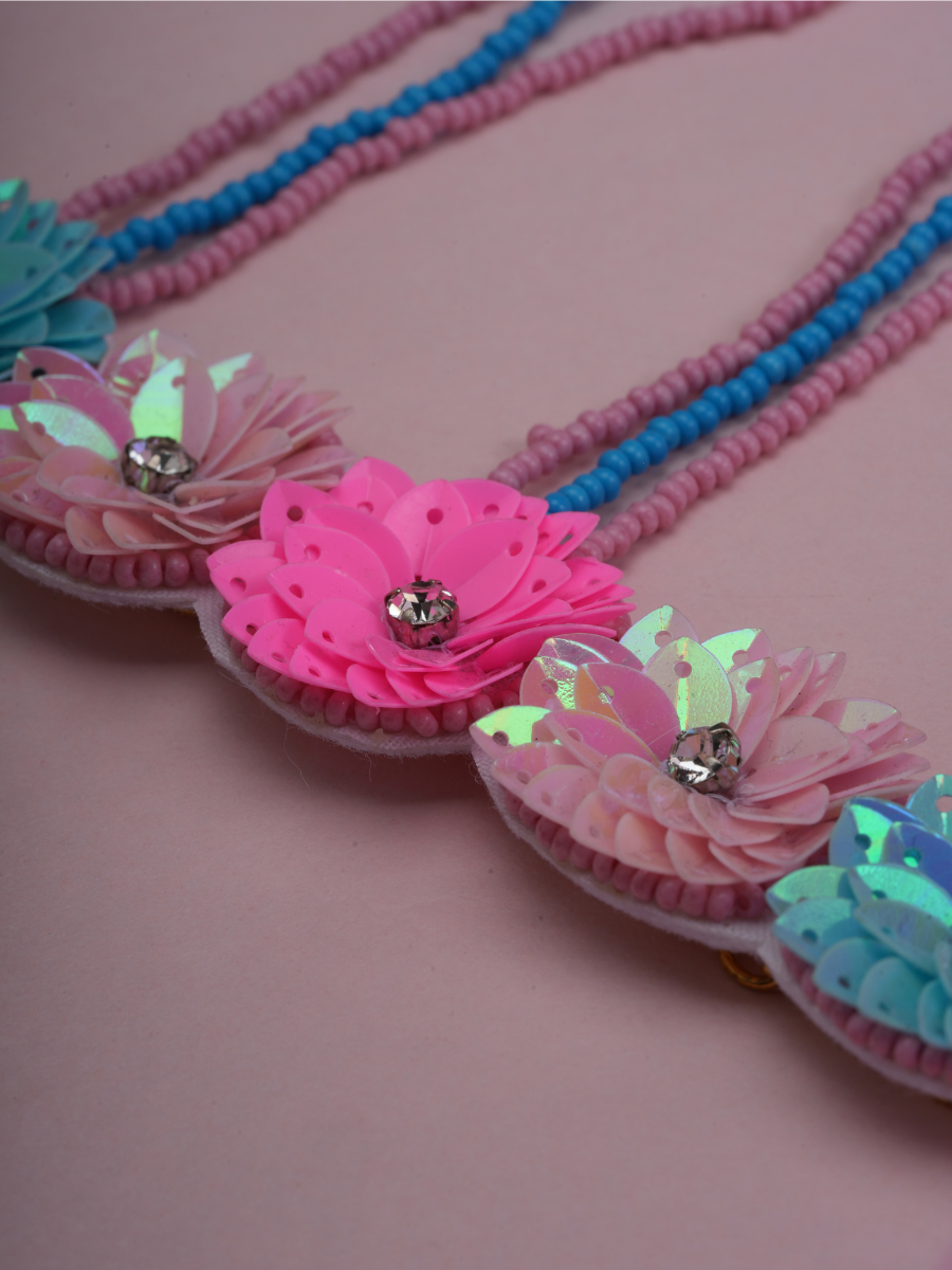 Fun, floral, and full of flair – the Phool Pop set is your go-to for those Mehendi, Haldi, or Sangeet moments when you want to stand out without the weight. Crafted with sequin florals in candy tones of pink, sky blue, and blush, this dreamy set includes earrings, choker, haathphool, and a matching sheeshphool. Lightweight yet statement-making, it's perfect for bridesmaids, sisters of the bride, or the playful bride herself!