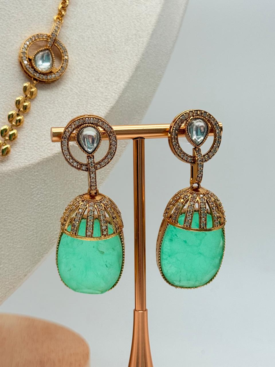 The Mint Crystal Droplet Set brings a breath of fresh air with its soothing mint gemstone finished in a transparent crystal sheen. The intricate lattice cap gives it a refined, premium touch, while the kundan halo adds subtle traditional brilliance. Light, breezy, and serene—this set shines beautifully in daylight functions.