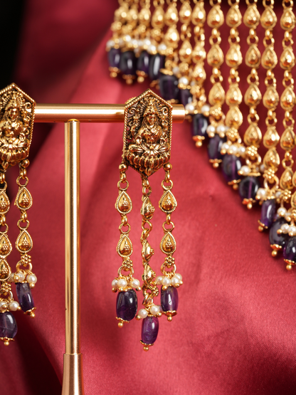Description: The Neelratna variant of Rajasiya Jharna drapes you in the mystic allure of deep purple amethyst-like beads. With intricate temple motifs and cascading gold drops, it channels divine elegance, perfect for grand festivities and traditional celebrations.
