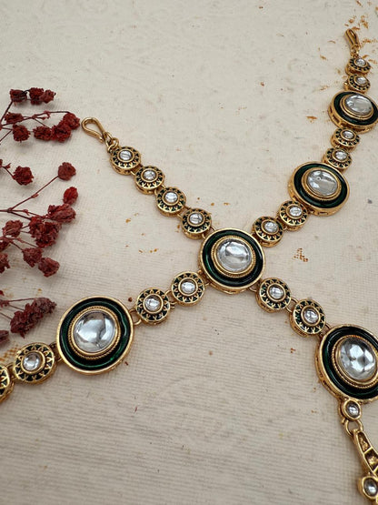 Radiating the brilliance of Rajasthan’s royal artistry, the Rajnoor Haar is a Kundan replica masterpiece that embodies heritage and elegance in perfect harmony. Crafted with glimmering mirror stones, rich emerald drops, and intricate gold detailing, it reflects the luminous aura of a true Rajnoor — the light of royalty.
