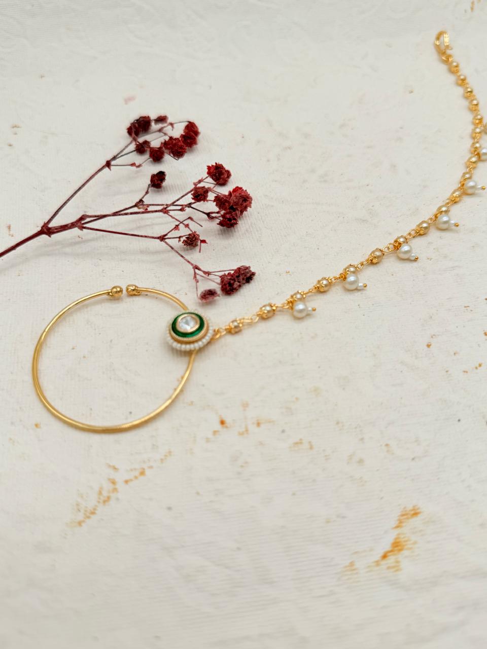 Paired with exquisite earrings, statement rings, a traditional sheeshpatti, nath, and haathphool, this set is perfect for brides who wish to embrace their inner queen with unmatched poise and sophistication.