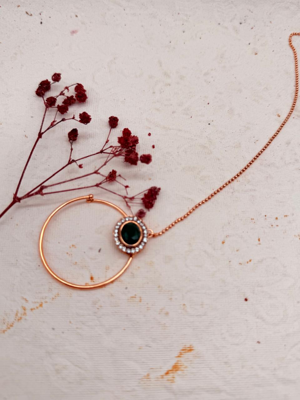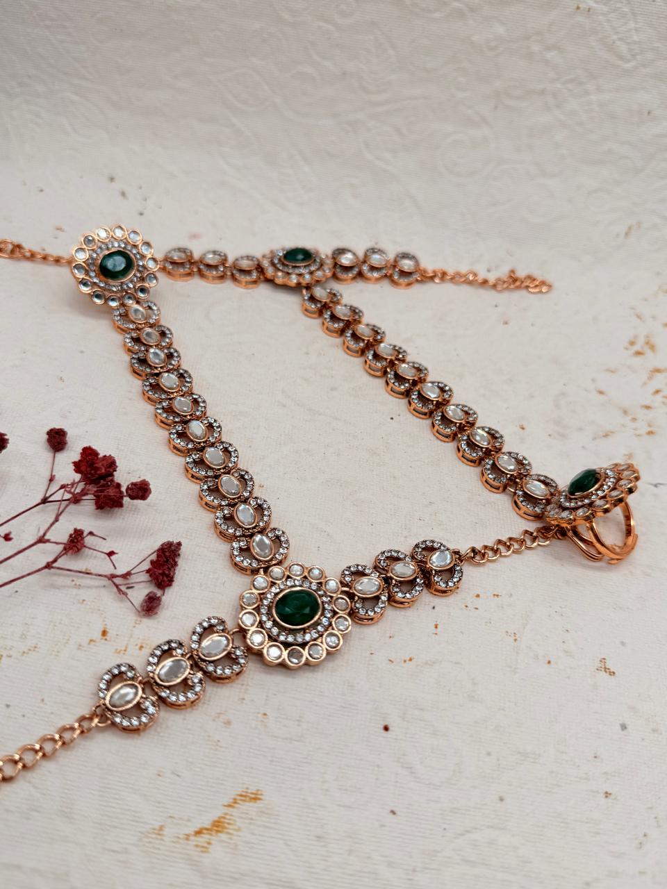 Set includes: Statement Necklace, Sheeshpatti, Nath, 2 Adjustable Rings, Earrings With Kaanchain.