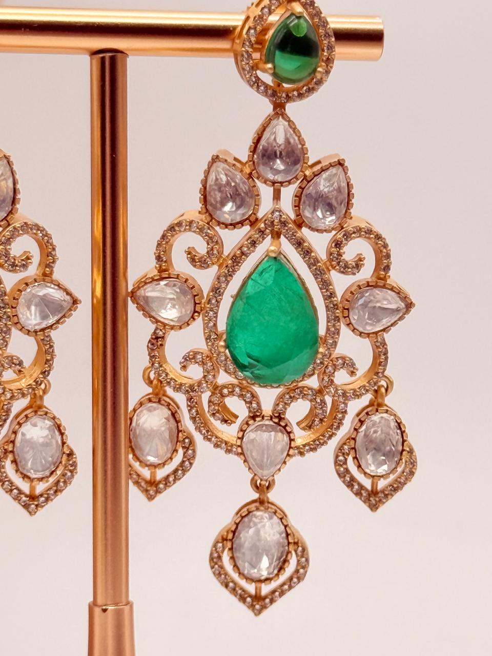 ✨ The Emerald Empress Polki Necklace Set features a majestic arrangement of radiant emerald-hued stones intricately set with Polki, framed by ornate gold-toned craftsmanship. The fluid necklace silhouette is designed to sit elegantly along the neckline, creating a regal statement that feels powerful yet refined.
