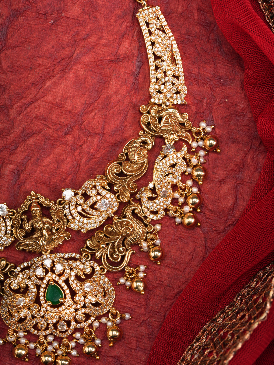 The Manohari Vilas Set features Goddess Lakshmi at its center, highlighted with emerald accents, pearls, and intricate gold detailing. A regal choice for brides and festive occasions.