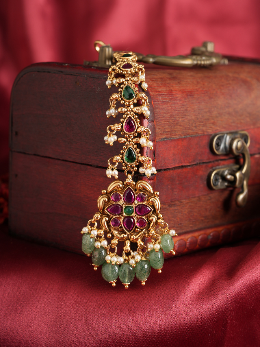 A poetic fusion of tradition and grace, the Ratilika – Green Pink is a celebration of soft femininity. Designed in antique temple style, this maang tikka features intricate floral motifs adorned with delicate green and pink jadau stones, framed in gold and highlighted with classic pearl danglers. Whether you're attending a festive ceremony or a bridal ritual, this piece adds a subtle yet striking charm to your look.