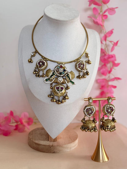 Antique Grace Hasli Set is a stunning blend of temple artistry and vintage sophistication, featuring intricate motifs, colored gemstones, and bold golden accents paired with traditional jhumka earrings.