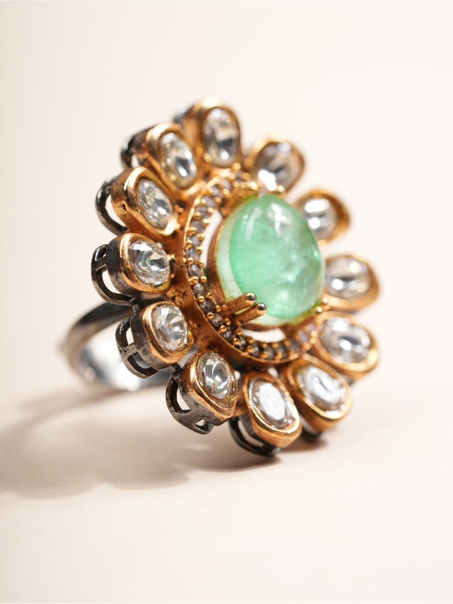 Bring a touch of royalty to your look with our Regal Green Blossom Statement Ring. This vintage-inspired cocktail ring features a bold, teardrop-shaped mint green synthetic stone at the center, surrounded by a dazzling halo of sparkling clear crystals. The intricate gold-tone flower motif radiates elegance and is perfect for special occasions, weddings, parties, or festive celebrations. Crafted from high-quality imitation materials for lasting shine, this adjustable ring ensures a comfortable fit for everyone.