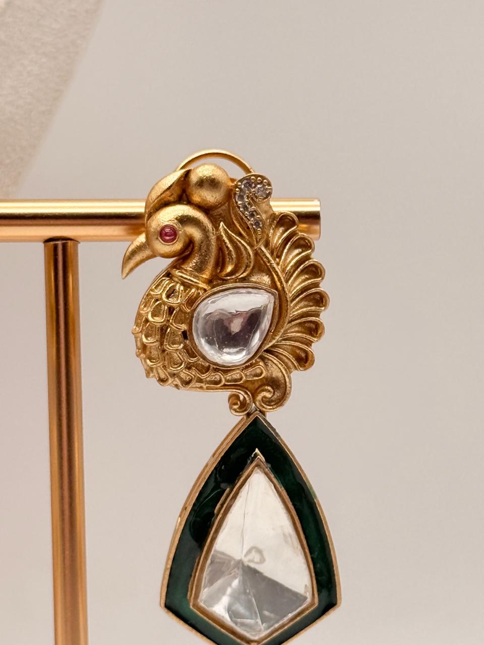 ✨ The Crown of Emeralds Necklace Set features rich emerald-green stones framed in opulent gold-toned craftsmanship, accentuated with luminous Polki detailing. The sculptural design, crowned with regal motifs and balanced symmetry, evokes the splendour of a royal crest—bold, commanding, and unforgettable.