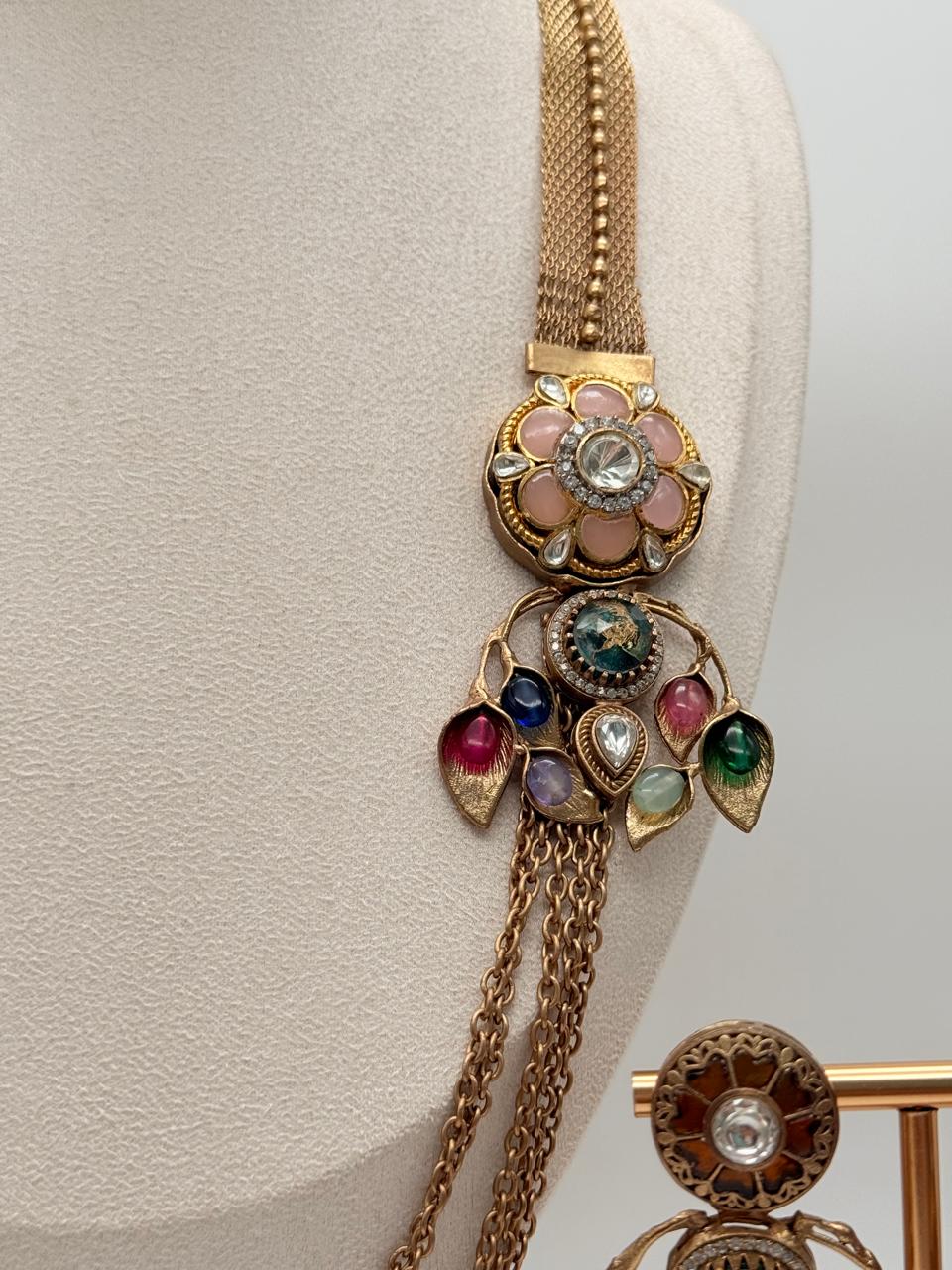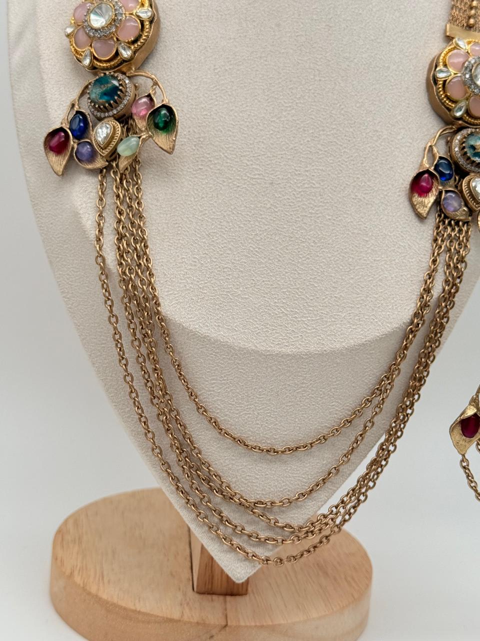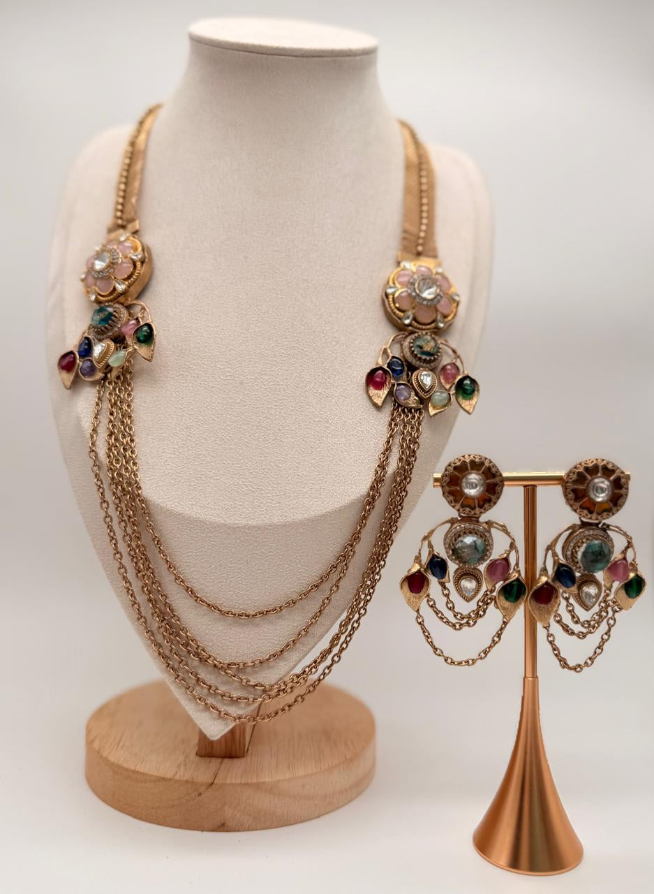 A celebration of colour, craft, and royal charm, the Rainbow Regent Cascade Set blends multigem brilliance with a vintage floral silhouette. The statement dual floral motifs bloom at the neckline, adorned with an array of radiant stones—each hand-set to reflect a spectrum of regal hues. Delicate chains flow gracefully in layered cascades, adding fluid movement and a luxurious draped effect.