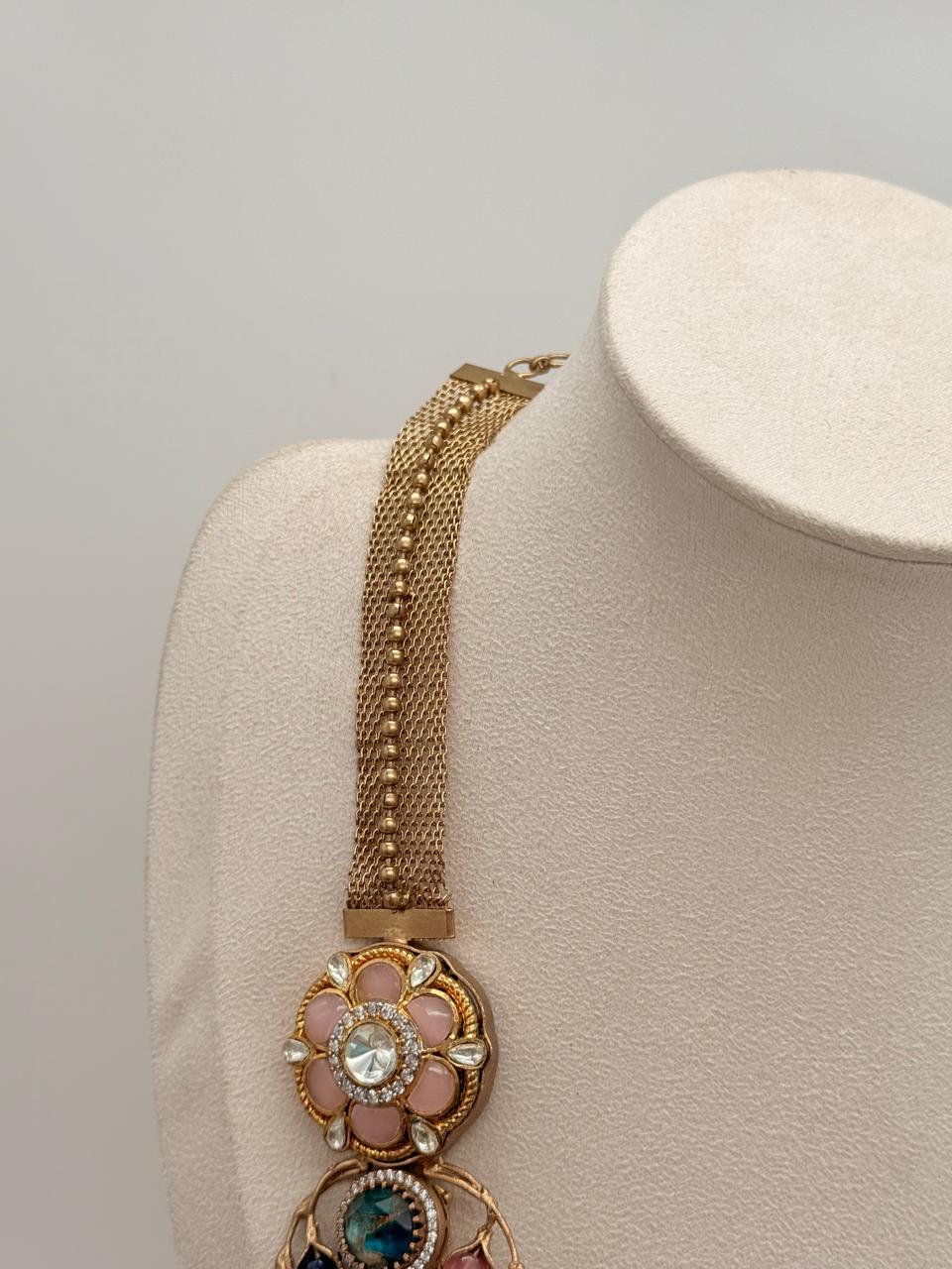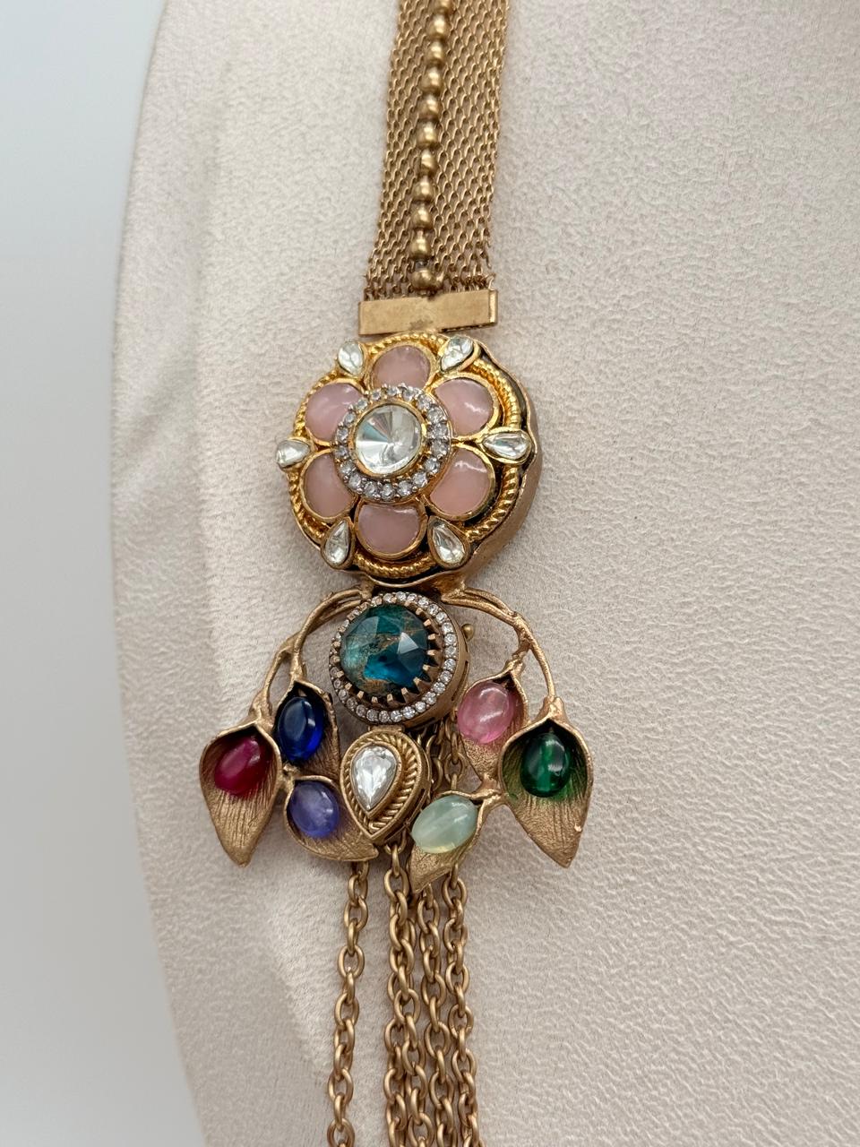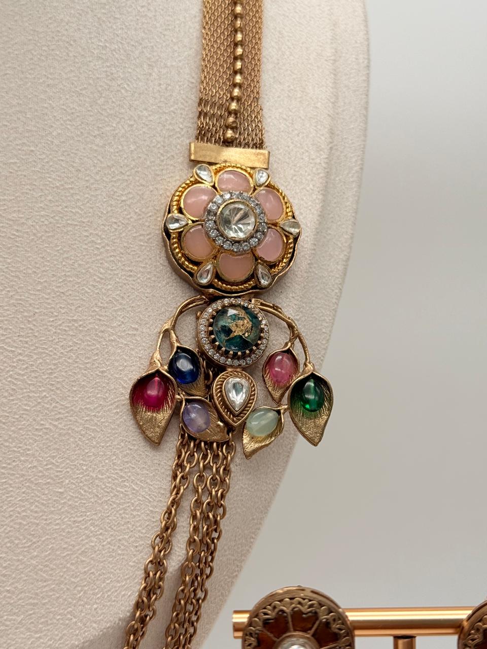 A celebration of colour, craft, and royal charm, the Rainbow Regent Cascade Set blends multigem brilliance with a vintage floral silhouette. The statement dual floral motifs bloom at the neckline, adorned with an array of radiant stones—each hand-set to reflect a spectrum of regal hues. Delicate chains flow gracefully in layered cascades, adding fluid movement and a luxurious draped effect.