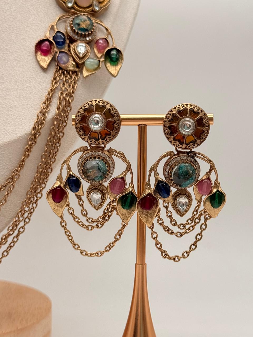 The coordinating earrings mirror the necklace’s multigem detailing and chain artistry, creating a perfectly balanced ensemble that feels both festive and timeless.