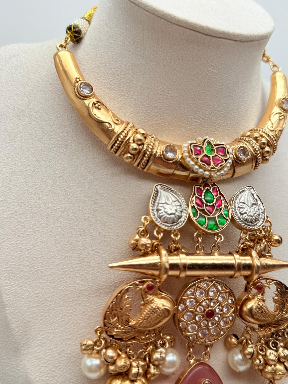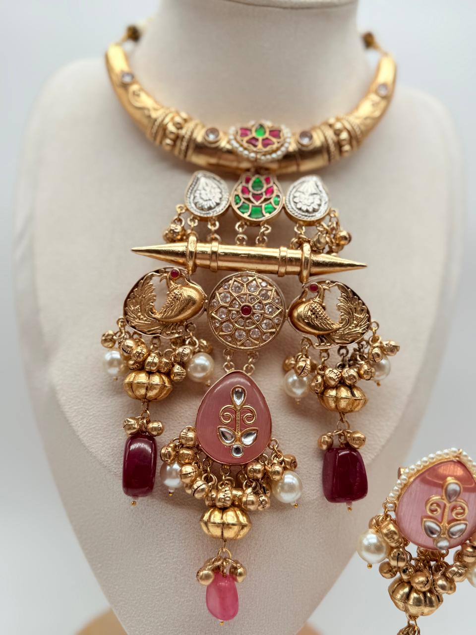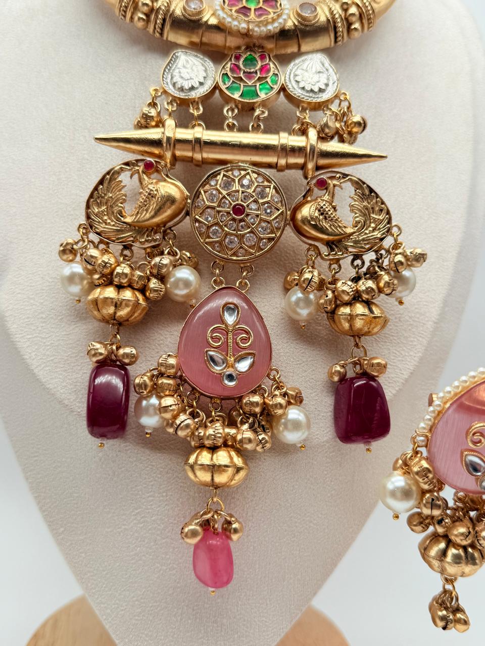 ✨A graceful celebration of softness and tradition, this royal hasli set features delicate blush-pink petal drops paired with lustrous pearls and antique gold detailing. The intricate motifs and gentle hues create a regal yet feminine charm—perfect for weddings, festive gatherings, and elegant day functions.