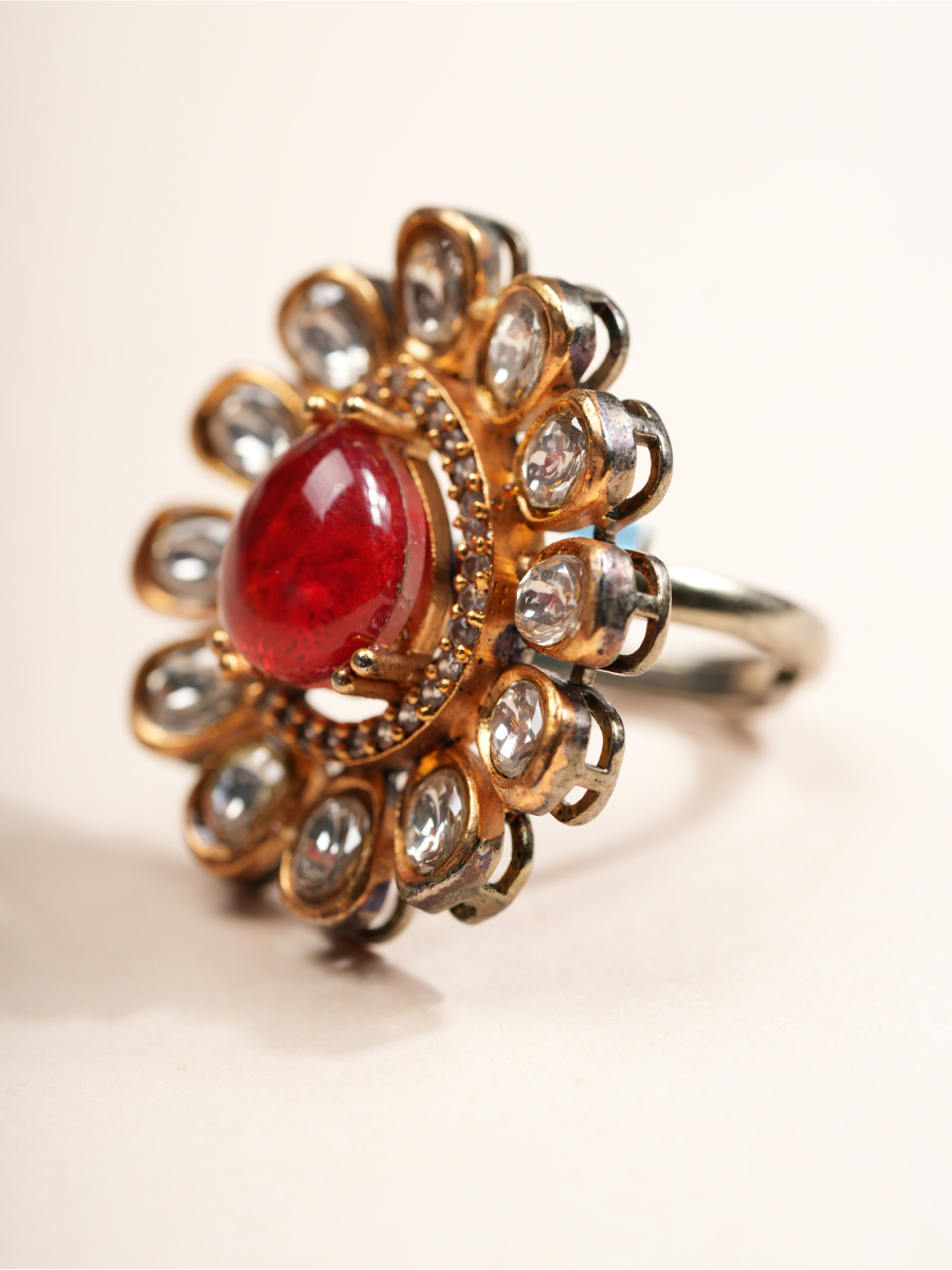 Bold, radiant, and regal — the Ruby Radiance Statement Ring is a celebration of traditional artistry and timeless glamour. At its core rests a mesmerizing deep scarlet cabochon, glowing with fiery intensity. Encircling it is a halo of sparkling polki-style white stones, each meticulously set in antique gold-tone bezels to form a floral-inspired design. The subtle detailing enhances its vintage appeal, making it perfect for pairing with ethnic ensembles. Whether gracing a bridal trousseau, adorning festive attire, or elevating a royal-inspired look, this adjustable ring is more than an accessory — it’s a statement of elegance and heritage.